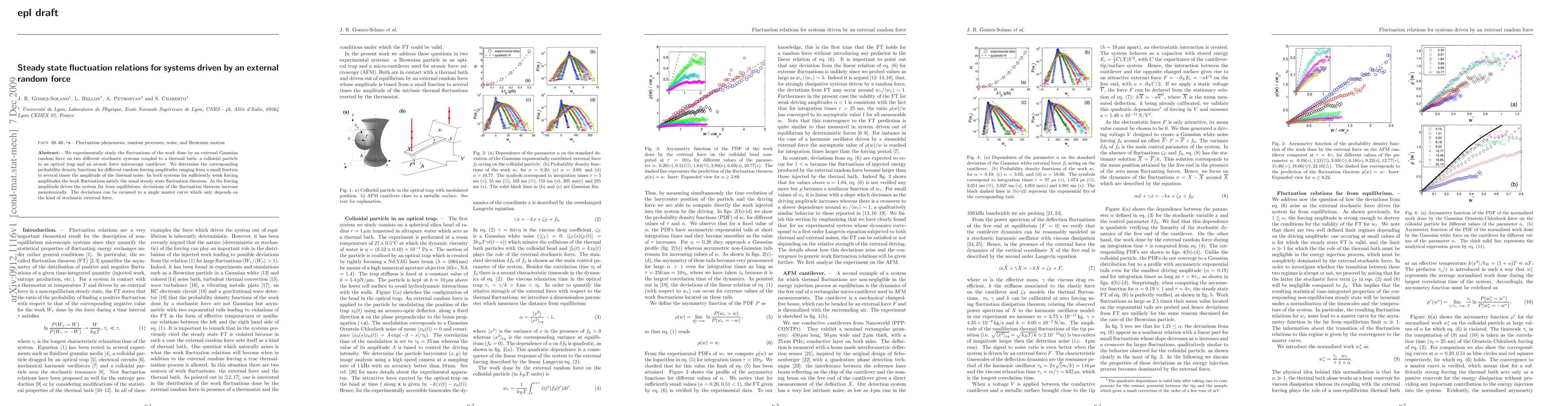 This paper experimentally investigates the work fluctuations in two stochastic systems driven by Gaussian random forces, showing that the steady state fluctuation theorem holds for weak forcing but deviates as the force increases, with deviations collapsing onto a single master curve dependent on the type of force.