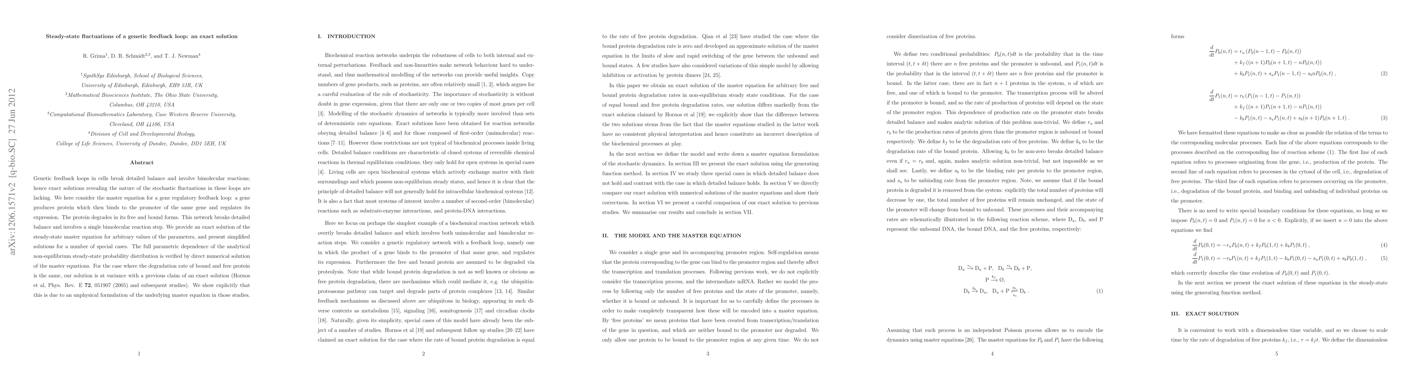 Genetic feedback loops in cells break detailed balance and involve bimolecular reactions; hence exact solutions revealing the nature of the stochastic fluctuations in these loops are lacking. We here consider the master equation for a gene regulatory feedback loop: a gene produces protein which then binds to the promoter of the same gene and regulates its expression. The protein degrades in its free and bound forms. This network breaks detailed balance and involves a single bimolecular reaction step. We provide an exact solution of the steady-state master equation for arbitrary values of the parameters, and present simplified solutions for a number of special cases. The full parametric dependence of the analytical non-equilibrium steady-state probability distribution is verified by direct numerical solution of the master equations. For the case where the degradation rate of bound and free protein is the same, our solution is at variance with a previous claim of an exact solution (Hornos et al, Phys. Rev. E {\bf 72}, 051907 (2005) and subsequent studies). We show explicitly that this is due to an unphysical formulation of the underlying master equation in those studies.