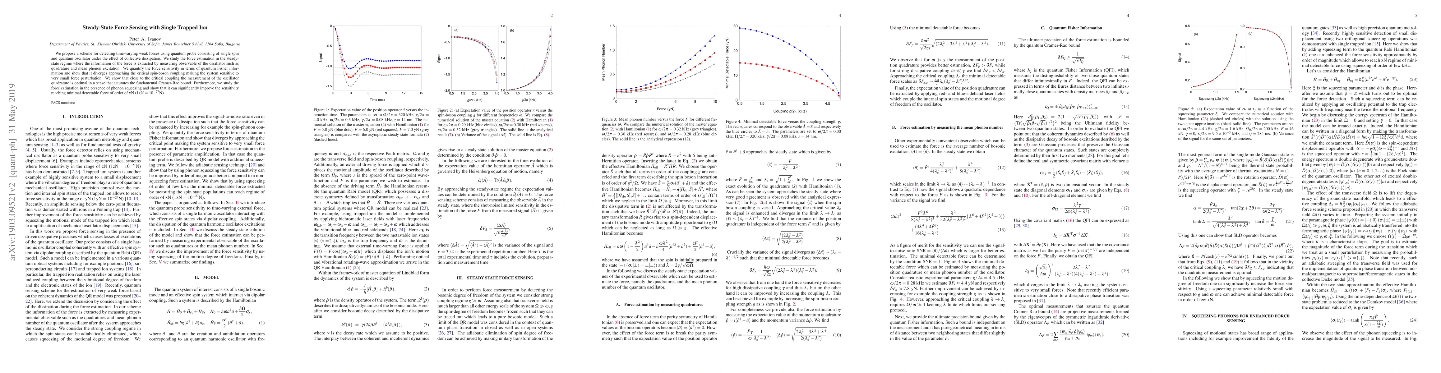We propose a scheme for detecting time-varying weak forces using quantum probe consisting of single spin and quantum oscillator under the effect of collective dissipation. We study the force estimation in the steady-state regime where the information of the force is extracted by measuring observable of the oscillator such as quadrature and mean phonon excitation. We quantify the force sensitivity in terms of quantum Fisher information and show that it diverges approaching the critical spin-boson coupling making the system sensitive to very small force perturbation. We show that close to the critical coupling the measurement of the oscillator quadrature is optimal in a sense that saturates the fundamental Cramer-Rao bound. Furthermore, we study the force estimation in the presence of phonon squeezing and show that it can significantly improve the sensitivity reaching minimal detectable force of order of xN (1${\rm xN=10^{-27}{\rm N}}$).
