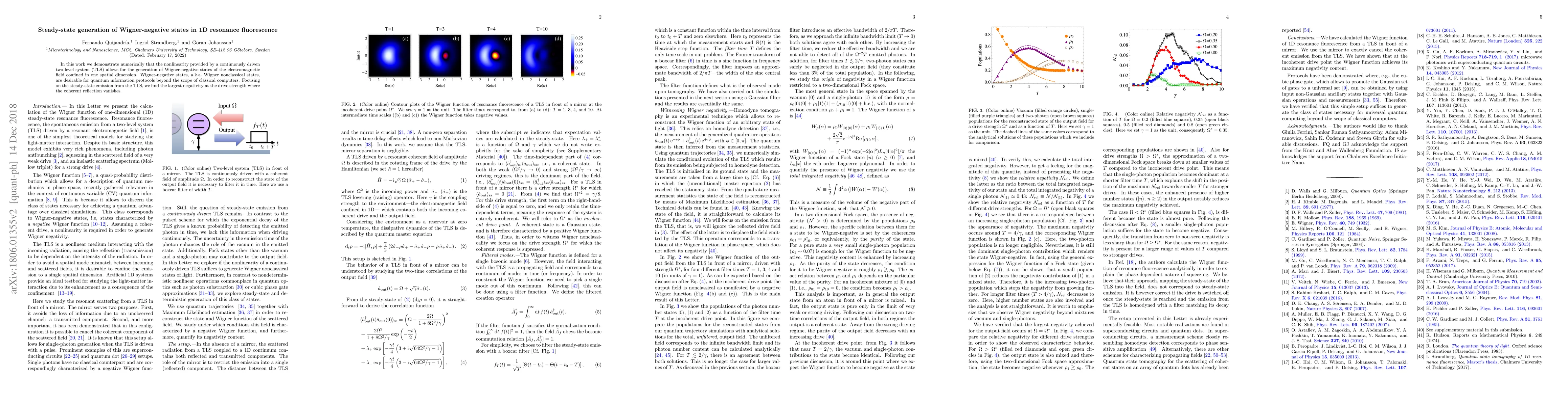 This paper demonstrates numerically that a continuously driven two-level system can generate Wigner-negative states in one-dimensional resonance fluorescence, which are valuable for quantum information processing. The study finds the highest negativity occurs when coherent reflection vanishes.
