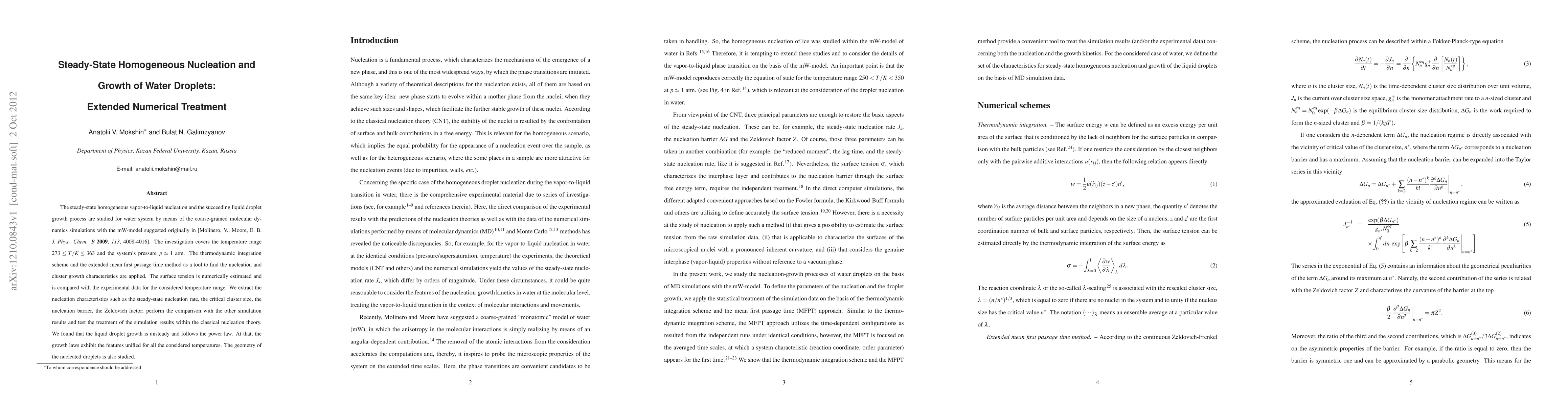 This paper investigates steady-state homogeneous nucleation and droplet growth in water using coarse-grained molecular dynamics simulations. The study reveals that droplet growth follows a power law and is unsteady, with consistent growth laws across different temperatures.