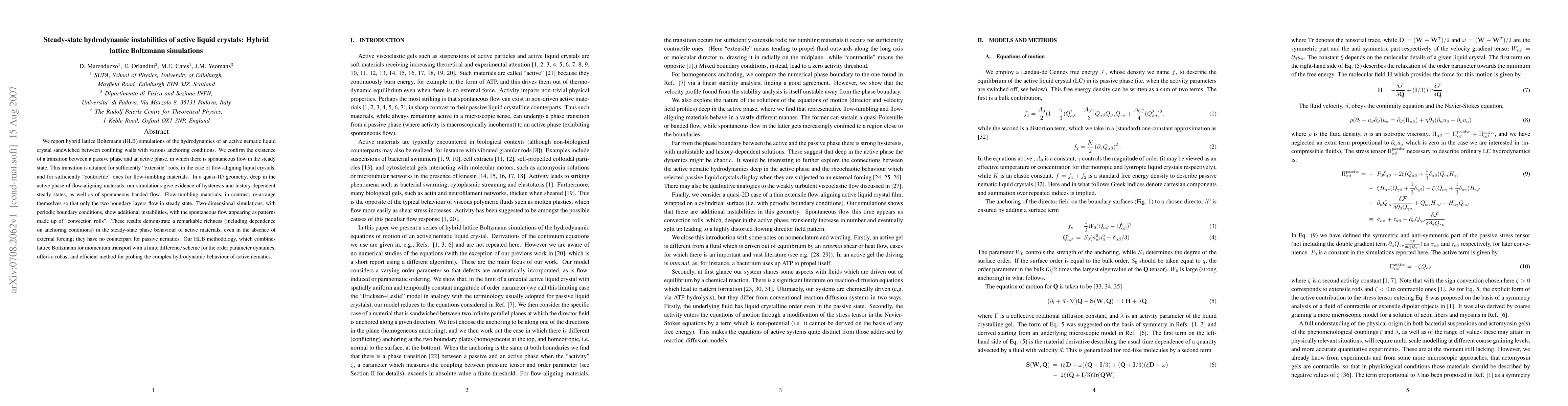 This paper uses hybrid lattice Boltzmann simulations to study the hydrodynamic instabilities in active nematic liquid crystals, revealing a transition from passive to active phases characterized by spontaneous flow. The simulations uncover complex steady-state behaviors, including hysteresis, banded flow, and convection rolls, depending on the material's flow properties and anchoring conditions.