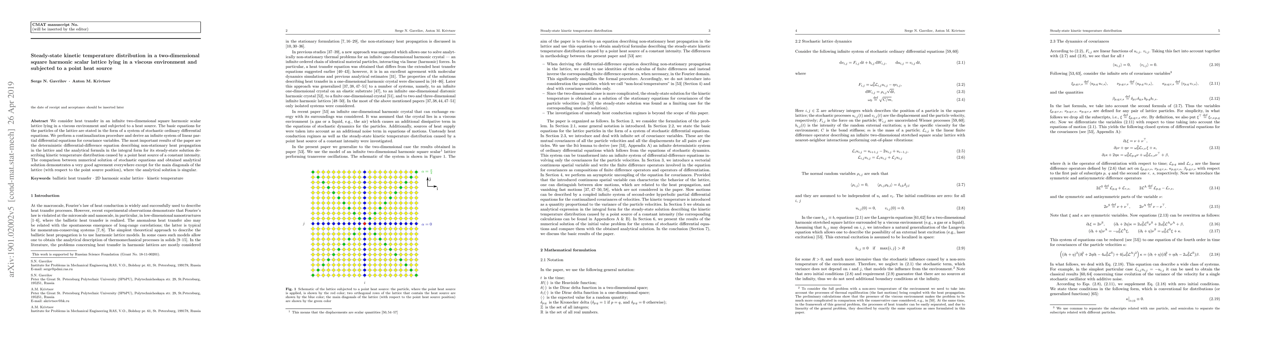 This paper investigates heat transfer in a two-dimensional square harmonic scalar lattice in a viscous environment with a point heat source, deriving a deterministic differential-difference equation for non-stationary heat propagation and an analytical formula for steady-state kinetic temperature distribution. Numerical and analytical solutions show good agreement except near the main diagonals relative to the source position.