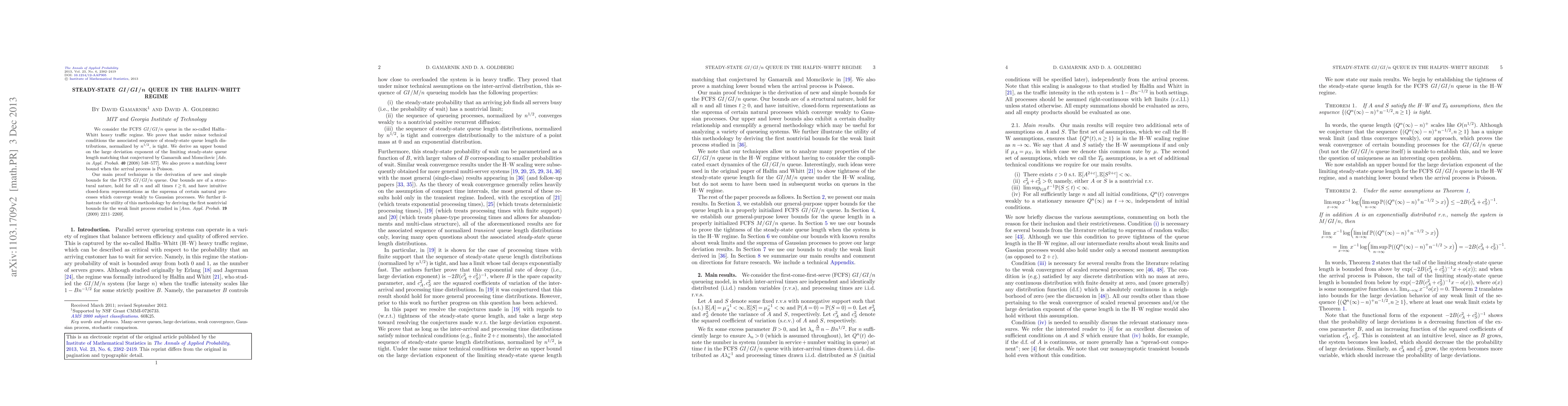We consider the FCFS $\mathit{GI}/\mathit{GI}/n$ queue in the so-called Halfin-Whitt heavy traffic regime. We prove that under minor technical conditions the associated sequence of steady-state queue length distributions, normalized by $n^{1/2}$, is tight. We derive an upper bound on the large deviation exponent of the limiting steady-state queue length matching that conjectured by Gamarnik and Momcilovic [Adv. in Appl. Probab. 40 (2008) 548-577]. We also prove a matching lower bound when the arrival process is Poisson. Our main proof technique is the derivation of new and simple bounds for the FCFS $\mathit{GI}/\mathit{GI}/n$ queue. Our bounds are of a structural nature, hold for all $n$ and all times $t\geq0$, and have intuitive closed-form representations as the suprema of certain natural processes which converge weakly to Gaussian processes. We further illustrate the utility of this methodology by deriving the first nontrivial bounds for the weak limit process studied in [Ann. Appl. Probab. 19 (2009) 2211-2269].