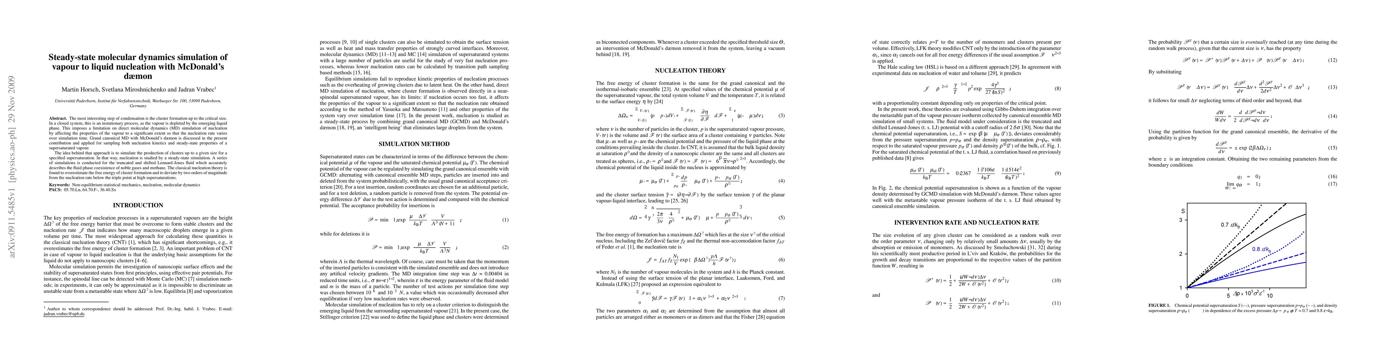 The most interesting step of condensation is the cluster formation up to the critical size. In a closed system, this is an instationary process, as the vapour is depleted by the emerging liquid phase. This imposes a limitation on direct molecular dynamics (MD) simulation of nucleation by affecting the properties of the vapour to a significant extent so that the nucleation rate varies over simulation time. Grand canonical MD with McDonald's daemon is discussed in the present contribution and applied for sampling both nucleation kinetics and steady-state properties of a supersaturated vapour. The idea behind that approach is to simulate the production of clusters up to a given size for a specified supersaturation. In that way, nucleation is studied by a steady-state simulation. A series of simulations is conducted for the truncated and shifted Lennard-Jones fluid which accurately describes the fluid phase coexistence of noble gases and methane. The classical nucleation theory is found to overestimate the free energy of cluster formation and to deviate by two orders of magnitude from the nucleation rate below the triple point at high supersaturations.