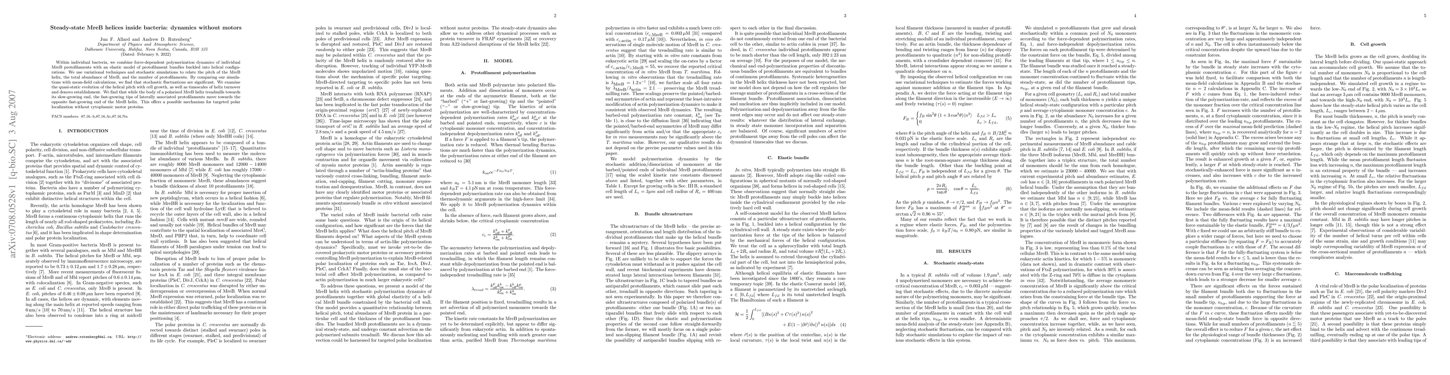 Within individual bacteria, we combine force-dependent polymerization dynamics of individual MreB protofilaments with an elastic model of protofilament bundles buckled into helical configurations. We use variational techniques and stochastic simulations to relate the pitch of the MreB helix, the total abundance of MreB, and the number of protofilaments. By comparing our simulations with mean-field calculations, we find that stochastic fluctuations are significant. We examine the quasi-static evolution of the helical pitch with cell growth, as well as timescales of helix turnover and denovo establishment. We find that while the body of a polarized MreB helix treadmills towards its slow-growing end, the fast-growing tips of laterally associated protofilaments move towards the opposite fast-growing end of the MreB helix. This offers a possible mechanism for targeted polar localization without cytoplasmic motor proteins.