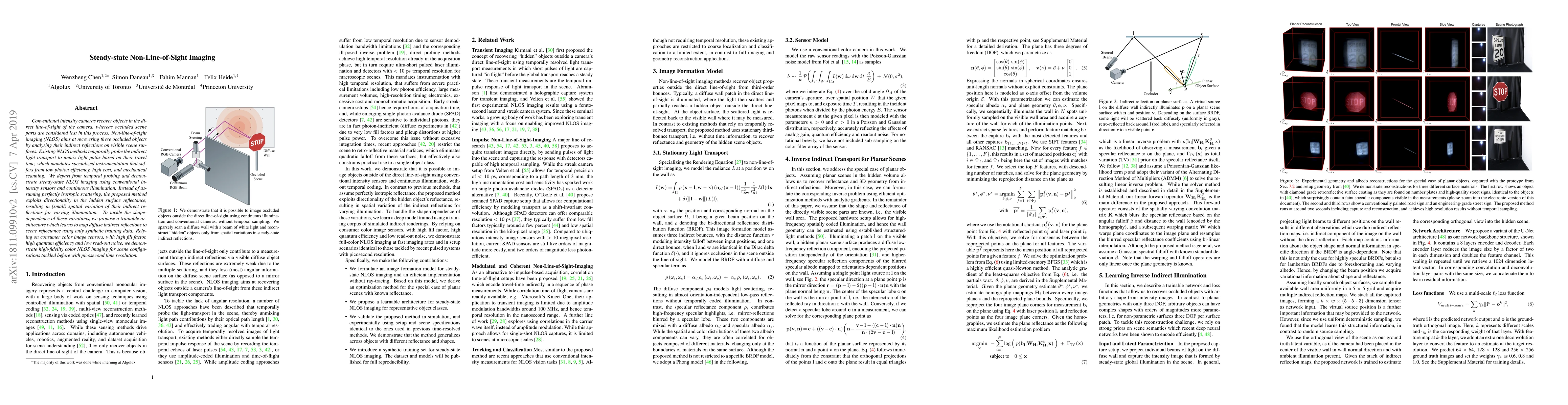 This paper presents a steady-state non-line-of-sight imaging technique using conventional intensity sensors and continuous illumination, bypassing the need for specialized temporal probing. It leverages the directionality of hidden surface reflectance to achieve high-fidelity color imaging of occluded objects using a trainable architecture.