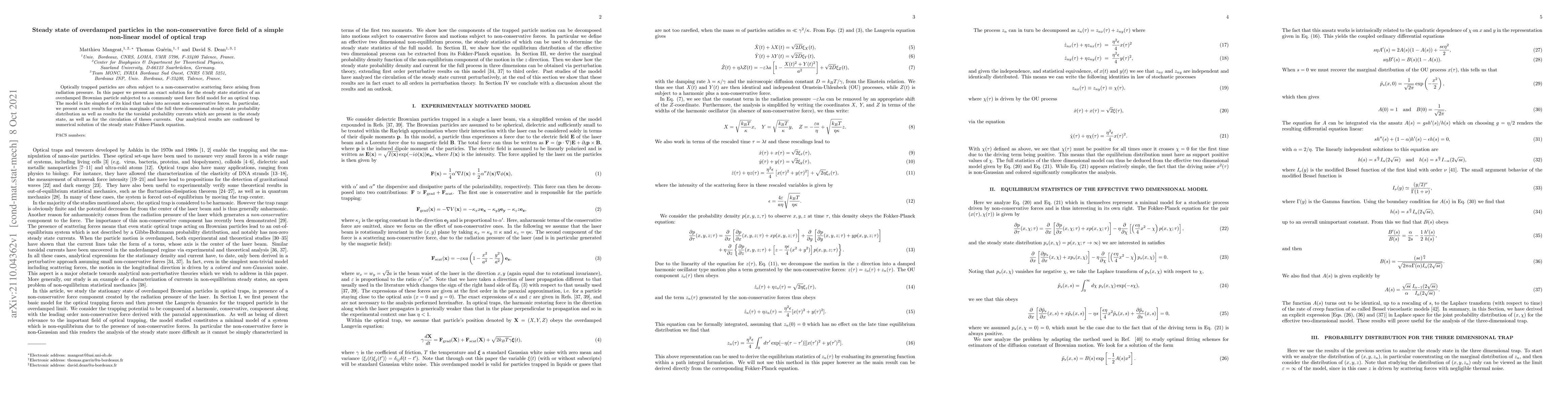 This paper presents an exact solution for the steady state statistics of overdamped Brownian particles in a non-conservative optical trap, focusing on marginals of the three-dimensional probability distribution and toroidal probability currents. Analytical results are validated through numerical solutions of the steady state Fokker-Planck equation.