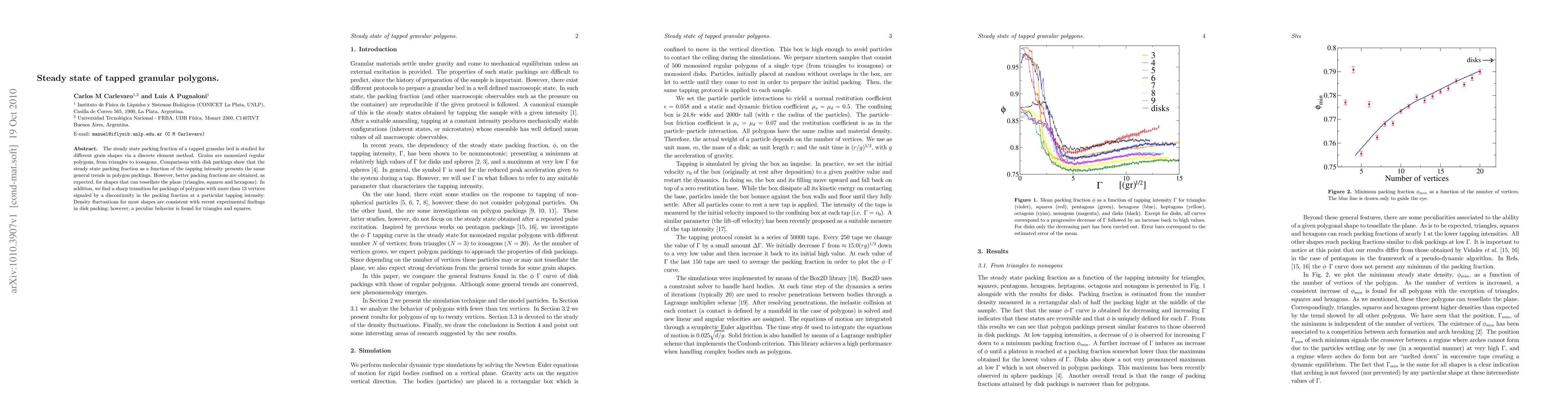 This study investigates the steady state packing fraction of tapped granular beds composed of monosized regular polygons using a discrete element method. The research reveals that shapes capable of tessellating the plane (triangles, squares, and hexagons) achieve higher packing fractions, while a sharp transition occurs for polygons with more than 13 vertices at a specific tapping intensity.