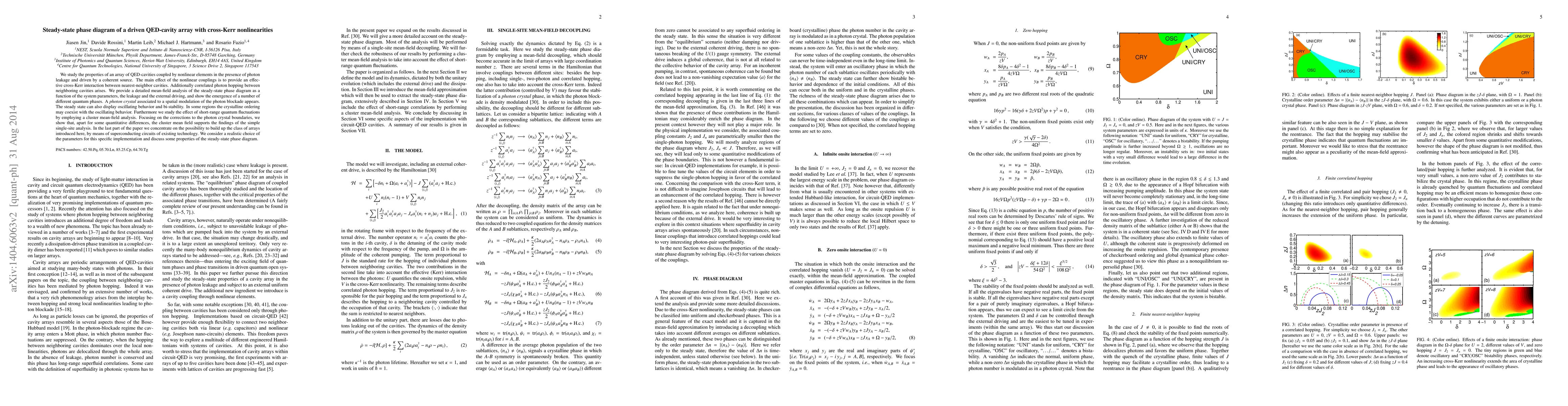 We study the properties of an array of QED-cavities coupled by nonlinear elements in the presence of photon leakage and driven by a coherent source. The main effect of the nonlinear couplings is to provide an effective cross-Kerr interaction between nearest-neighbor cavities. Additionally, correlated photon hopping between neighboring cavities arises. We provide a detailed mean-field analysis of the steady-state phase diagram as a function of the system parameters, the leakage, and the external driving, and show the emergence of a number of different quantum phases. A photon crystal associated to a spatial modulation of the photon blockade appears. The steady state can also display oscillating behavior and bistability. In some regions the crystalline ordering may coexist with the oscillating behavior. Furthermore we study the effect of short-range quantum fluctuations by employing a cluster mean-field analysis. Focusing on the corrections to the photon crystal boundaries, we show that, apart for some quantitative differences, the cluster mean field supports the findings of the simple single-site analysis. In the last part of the paper we concentrate on the possibility to build up the class of arrays introduced here, by means of superconducting circuits of existing technology. We consider a realistic choice of the parameters for this specific implementation and discuss some properties of the steady-state phase diagram.