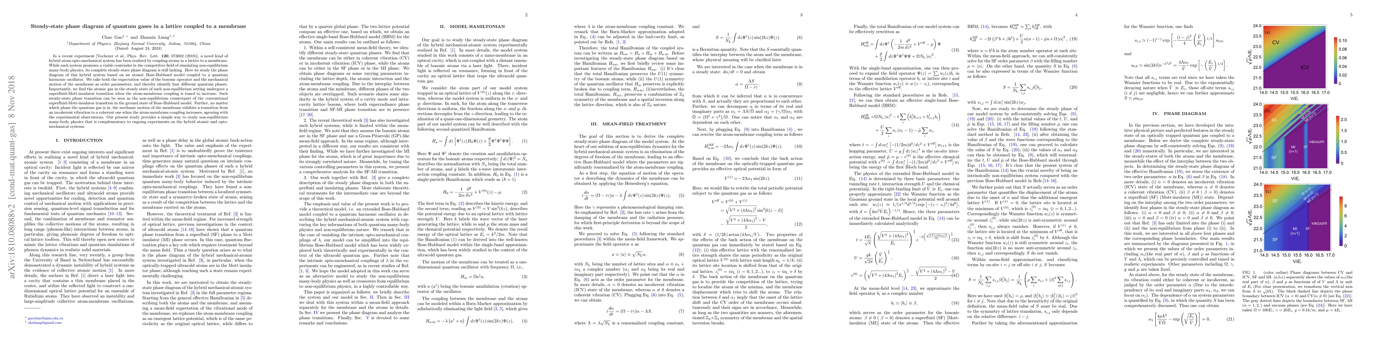 This paper investigates the steady-state phase diagram of quantum gases in a lattice coupled to a membrane, identifying four distinct quantum phases and a superfluid-Mott-insulator transition driven by atom-membrane coupling. It also confirms the transition from incoherent to coherent membrane vibrations with increasing coupling, aligning with experimental observations.