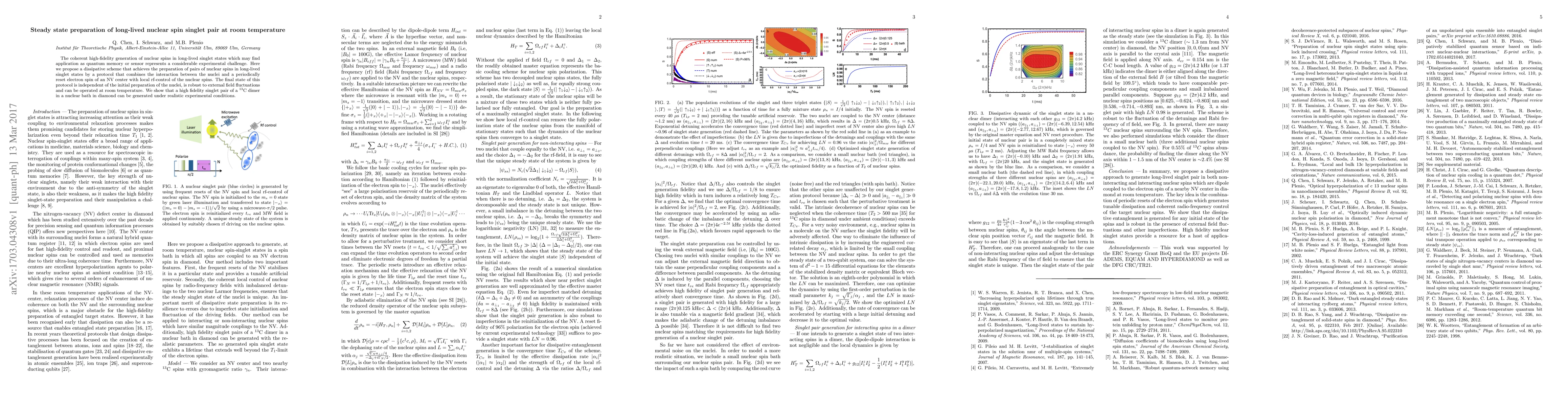 This paper proposes a method to generate high-fidelity long-lived nuclear spin singlet pairs at room temperature using a dissipative scheme involving an NV center and local rf-control, demonstrating its application in a 13C dimer in diamond. The protocol is robust to external field fluctuations and independent of initial nuclear spin states.