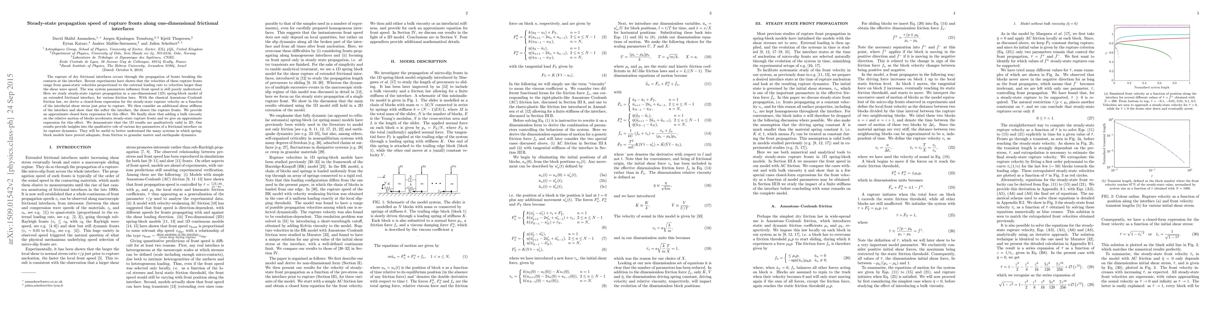 This paper investigates the steady-state propagation speed of rupture fronts along one-dimensional frictional interfaces using a spring-block model, deriving expressions for rupture velocity under different friction laws and interface conditions. The study reveals that softer interfaces slow rupture speeds while bulk viscosity accelerates them, providing valuable insights for understanding systems like earthquake dynamics.