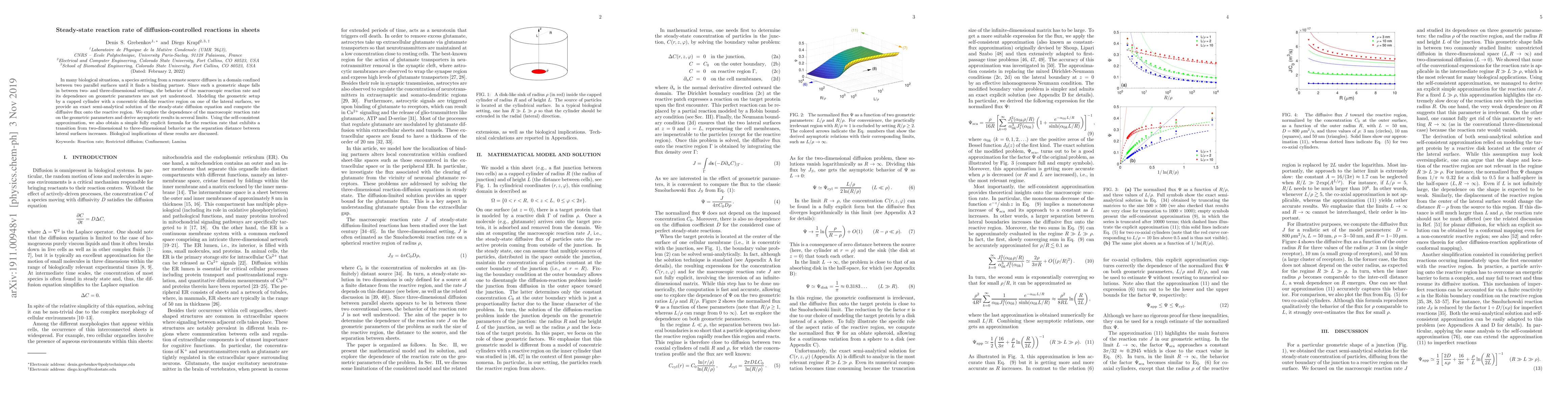 Researchers model diffusion-controlled reactions in a confined domain between two parallel surfaces and derive a simple formula for reaction rate that transitions from 2D to 3D behavior as separation distance increases.