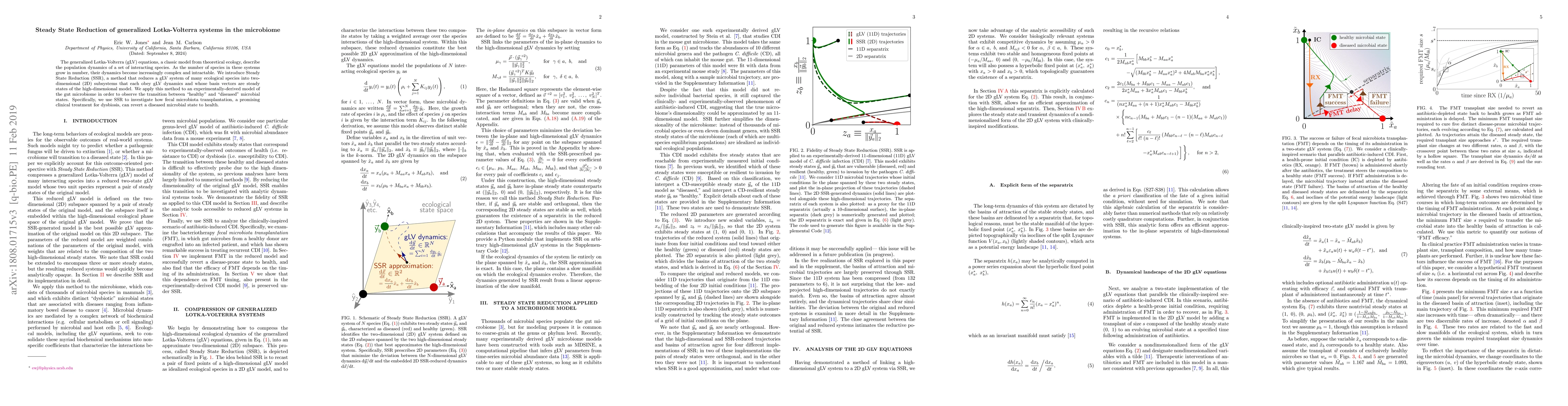 A new method called Steady State Reduction is used to simplify complex microbiome models into two-dimensional systems, revealing how fecal transplantation can reverse diseased microbial states.