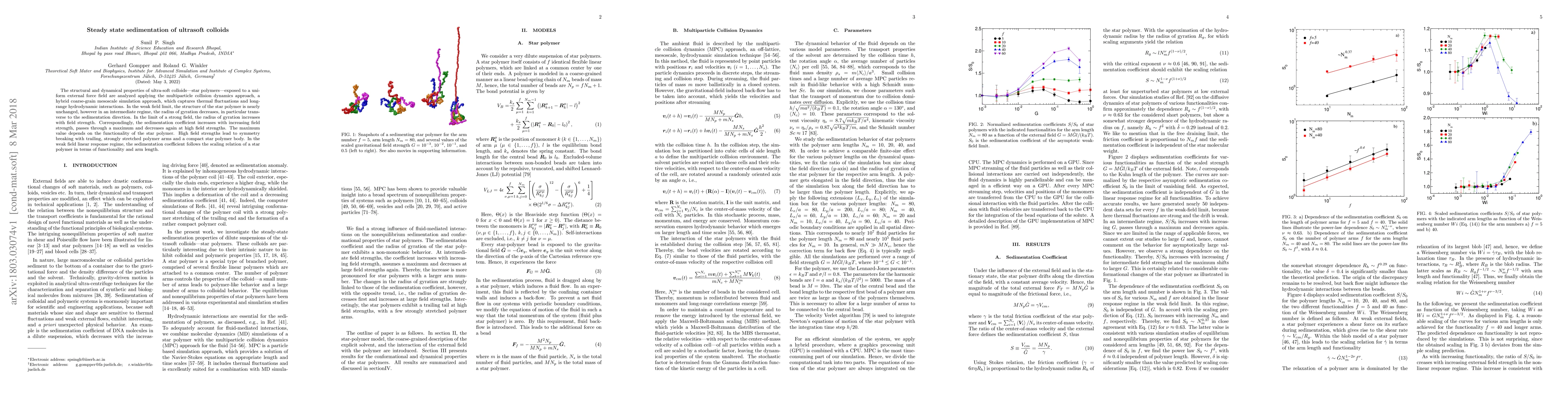 The structural and dynamical properties of ultra-soft colloids - star polymers - exposed to a uniform external force field are analyzed applying the multiparticle collision dynamics approach, a hybrid coarse-grain mesoscale simulation approach, which captures thermal fluctuations and long-range hydrodynamic interactions. In the weak field limit, the structure of the star polymer is nearly unchanged, however in an intermediate regime, the radius of gyration decreases, in particular transverse to the sedimentation direction. In the limit of a strong field, the radius of gyration increases with field strength. Correspondingly, the sedimentation coefficient increases with increasing field strength, passes through a maximum and decreases again at high field strengths. The maximum value depends on the functionality of the star polymer. High field strengths lead to symmetry breaking with trailing, strongly stretched polymer arms and a compact star polymer body. In the weak field linear response regime, the sedimentation coefficient follows the scaling relation of a star polymer in terms of functionality and arm length.