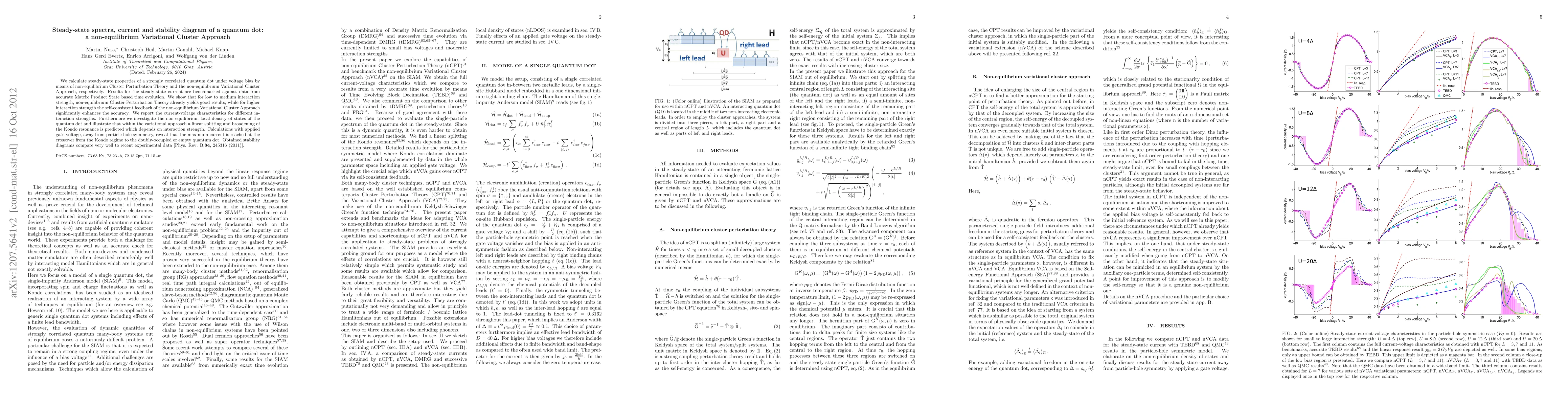 This paper uses non-equilibrium Variational Cluster Approach and Cluster Perturbation Theory to study the steady-state properties of a strongly correlated quantum dot under voltage bias, showing that the Variational Cluster Approach enhances accuracy for higher interaction strengths. It reports current-voltage characteristics and stability diagrams that match experimental data.