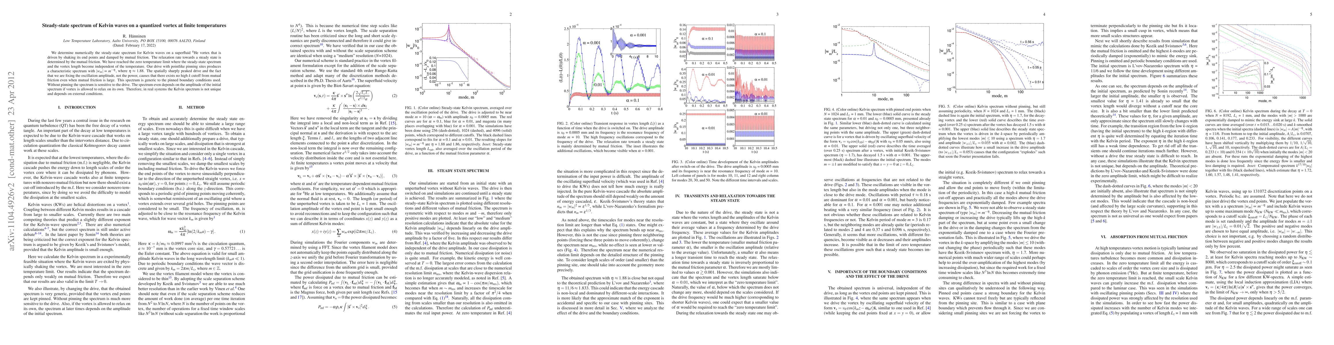 This research numerically investigates the steady-state spectrum of Kelvin waves on a superfluid 4He vortex driven by shaking and damped by mutual friction, revealing a spectrum with $|w_m|\propto m^{-\eta}$ where $\eta \approx$ 1.88. The study finds that the spectrum is influenced by pinning conditions and initial conditions, indicating that it is not unique in real systems.