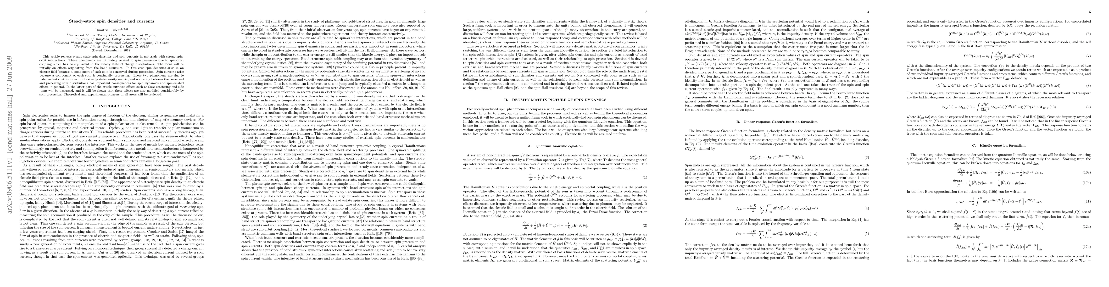 The paper reviews steady-state spin densities and currents in materials with strong spin-orbit interactions, focusing on effects originating from band structure and later discussing extrinsic effects like skew scattering and side jump.