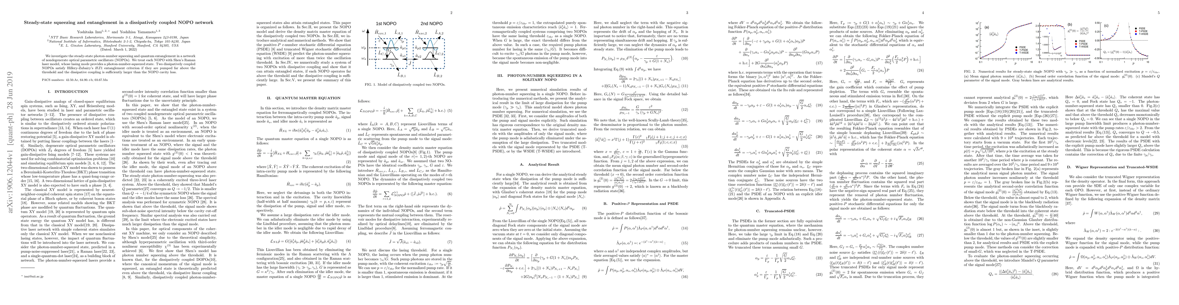 We investigate the steady-state photon-number squeezing and quantum entanglement in a network of nondegenerate optical parametric oscillators (NOPOs). We treat each NOPO with Shen's Raman laser model, whose lasing mode provides a photon-number-squeezed state. Two dissipatively coupled NOPOs satisfy Hillery-Zubairy's $HZ1$ entanglement criterion if they are pumped far above the threshold and the dissipative coupling is sufficiently larger than the NOPO cavity loss.