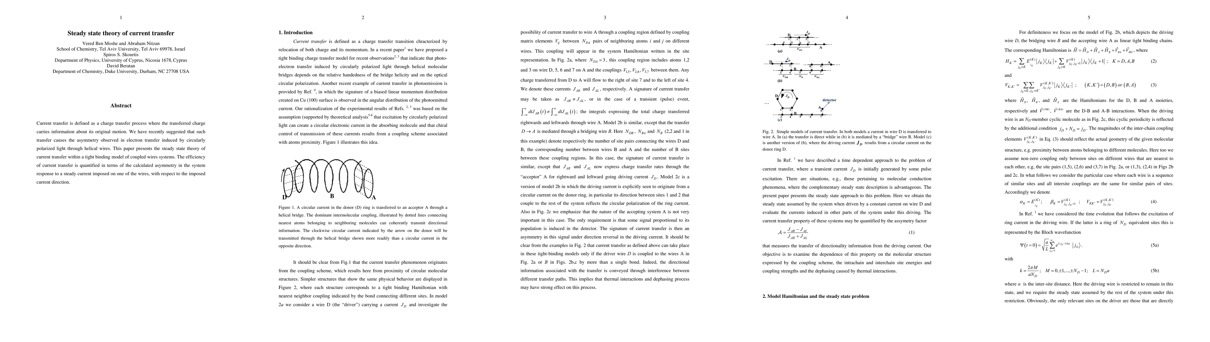 Current transfer is defined as a charge transfer process where the transferred charge carries information about its original motion. We have recently suggested that such transfer causes the asymmetry observed in electron transfer induced by circularly polarized light through helical wires. This paper presents the steady state theory of current transfer within a tight binding model of coupled wires systems. The efficiency of current transfer is quantified in terms of the calculated asymmetry in the system response to a steady current imposed on one of the wires, with respect to the imposed current direction.