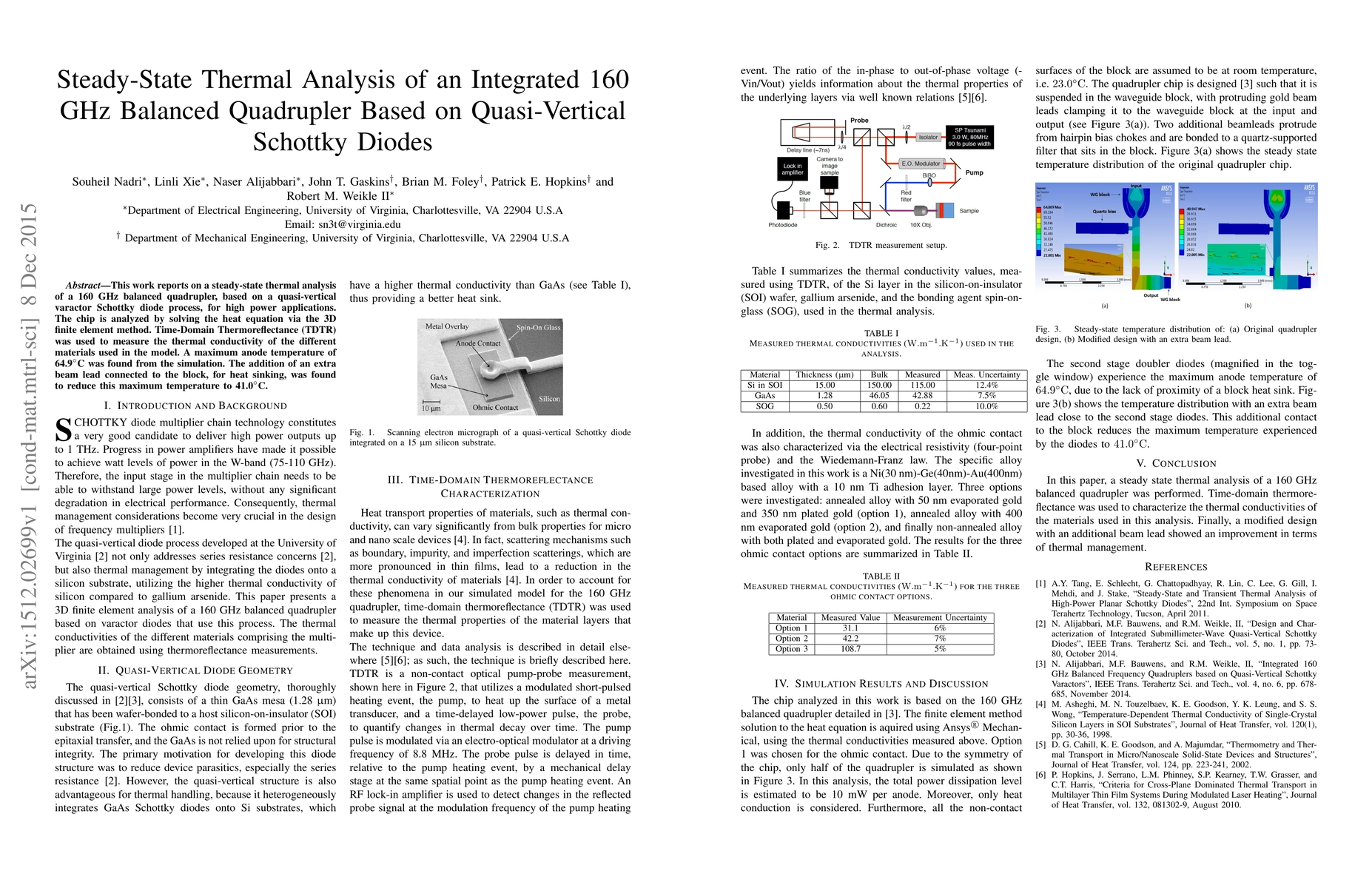 Researchers analyzed a 160 GHz balanced quadrupler using 3D finite element method to study its thermal performance, finding a maximum anode temperature of 64.9 C that decreased to 41.0 C with added heat sinking.