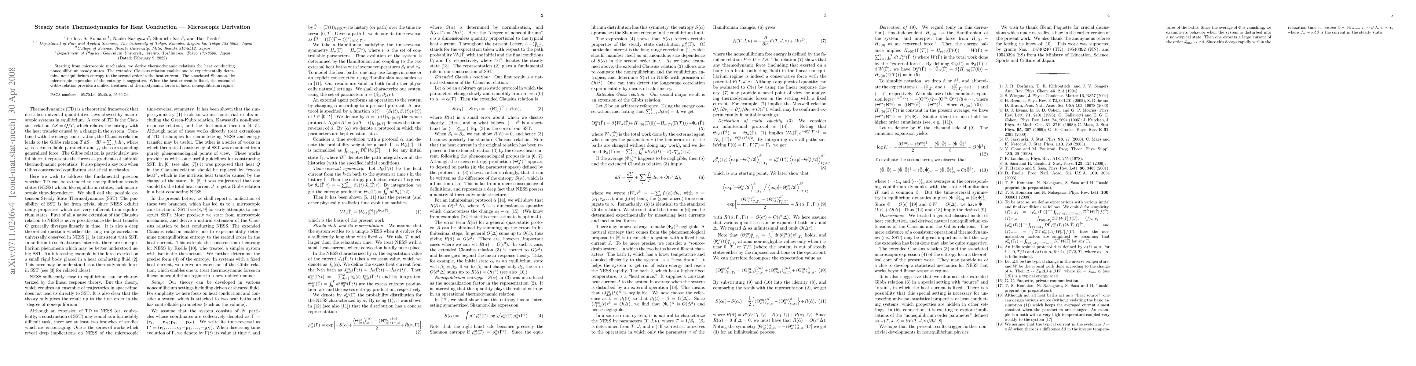 This paper derives thermodynamic relations for heat conduction in nonequilibrium steady states from microscopic mechanics, employing the extended Clausius relation to determine entropy to second order in heat current. It also presents a unified Gibbs relation for thermodynamic forces in the linear nonequilibrium regime when the heat current is fixed.