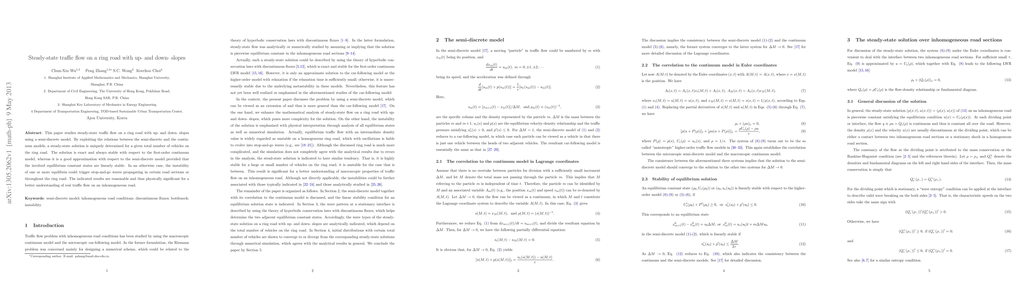 This paper determines a steady-state solution for traffic flow on a ring road with varying slopes using a semi-discrete model, showing it is stable and approximates the continuum model well under linear stability conditions, while potential instability may cause stop-and-go waves. The findings are significant for understanding real traffic dynamics on inhomogeneous roads.