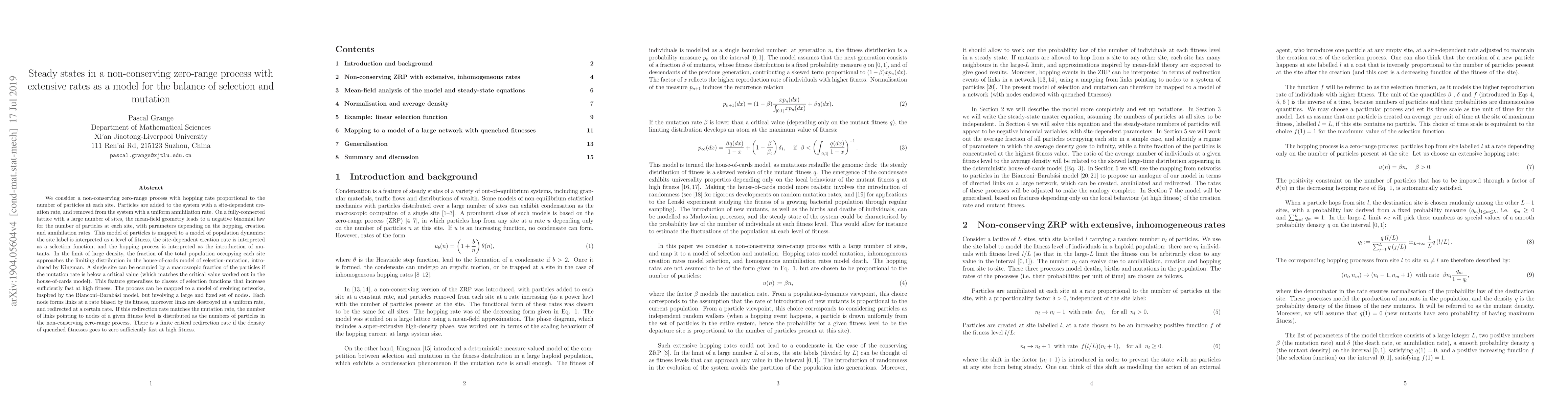 We consider a non-conserving zero-range process with hopping rate proportional to the number of particles at each site. Particles are added to the system with a site-dependent creation rate, and removed from the system with a uniform annihilation rate. On a fully-connected lattice with a large number of sites, the mean-field geometry leads to a negative binomial law for the number of particles at each site, with parameters depending on the hopping, creation and annihilation rates. This model of particles is mapped to a model of population dynamics: the site label is interpreted as a level of fitness, the site-dependent creation rate is interpreted as a selection function, and the hopping process is interpreted as the introduction of mutants. In the limit of large density, the fraction of the total population occupying each site approaches the limiting distribution in the house-of-cards model of selection-mutation, introduced by Kingman. A single site can be occupied by a macroscopic fraction of the particles if the mutation rate is below a critical value (which matches the critical value worked out in the house-of-cards model). This feature generalises to classes of selection functions that increase sufficiently fast at high fitness. The process can be mapped to a model of evolving networks, inspired by the Bianconi--Barab\'asi model, but involving a large and fixed set of nodes. Each node forms links at a rate biased by its fitness, moreover links are destroyed at a uniform rate, and redirected at a certain rate. If this redirection rate matches the mutation rate, the number of links pointing to nodes of a given fitness level is distributed as the numbers of particles in the non-conserving zero-range process. There is a finite critical redirection rate if the density of quenched fitnesses goes to zero sufficiently fast at high fitness.