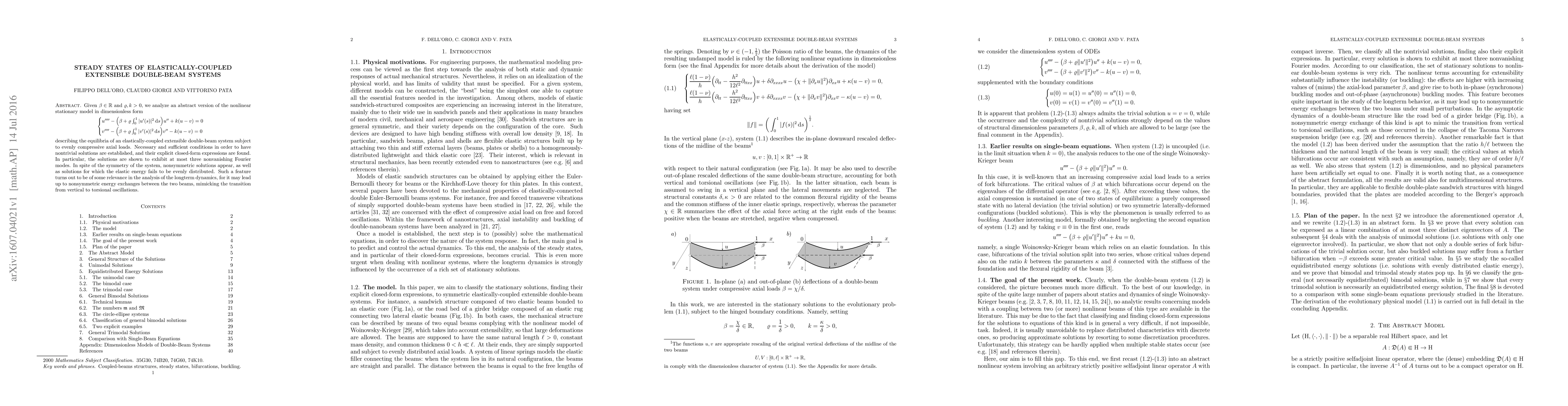 Given $\beta\in\mathbb{R}$ and $\varrho,k>0$, we analyze an abstract version of the nonlinear stationary model in dimensionless form $$\begin{cases} u"" - \Big(\beta+ \varrho\int_0^1 |u'(s)|^2\,{\rm d} s\Big)u" +k(u-v) = 0 v"" - \Big(\beta+ \varrho\int_0^1 |v'(s)|^2\,{\rm d} s\Big)v" -k(u-v) = 0 \end{cases} $$ describing the equilibria of an elastically-coupled extensible double-beam system subject to evenly compressive axial loads. Necessary and sufficient conditions in order to have nontrivial solutions are established, and their explicit closed-form expressions are found. In particular, the solutions are shown to exhibit at most three nonvanishing Fourier modes. In spite of the symmetry of the system, nonsymmetric solutions appear, as well as solutions for which the elastic energy fails to be evenly distributed. Such a feature turns out to be of some relevance in the analysis of the longterm dynamics, for it may lead up to nonsymmetric energy exchanges between the two beams, mimicking the transition from vertical to torsional oscillations.