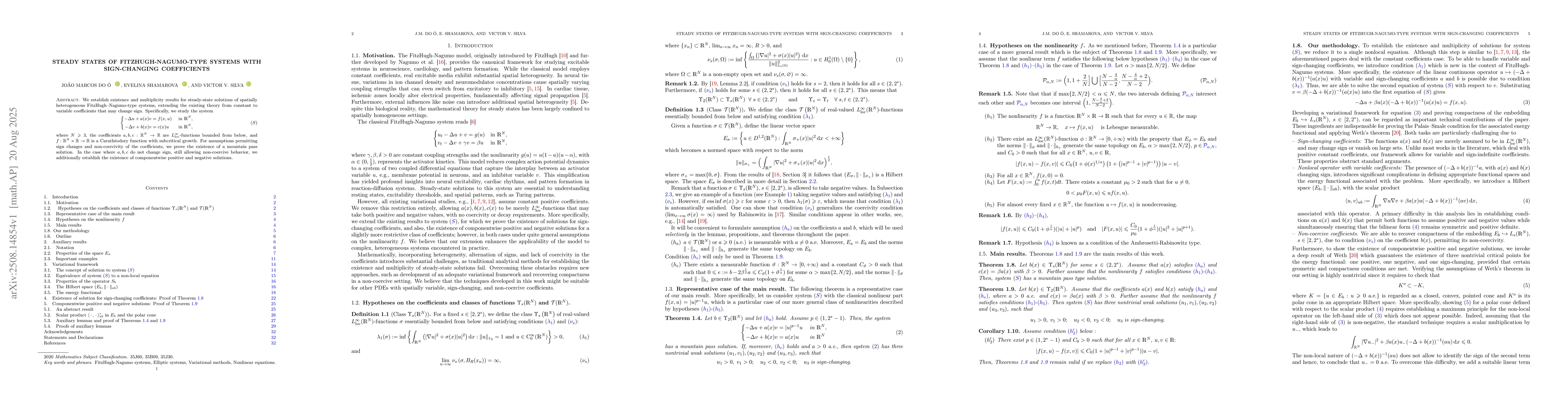 This study extends the understanding of FitzHugh-Nagumo models by providing existence and multiplicity results for steady-state solutions with variable coefficients, which can change sign, contributing to the theoretical framework for analyzing complex dynamical systems in biology and physics.