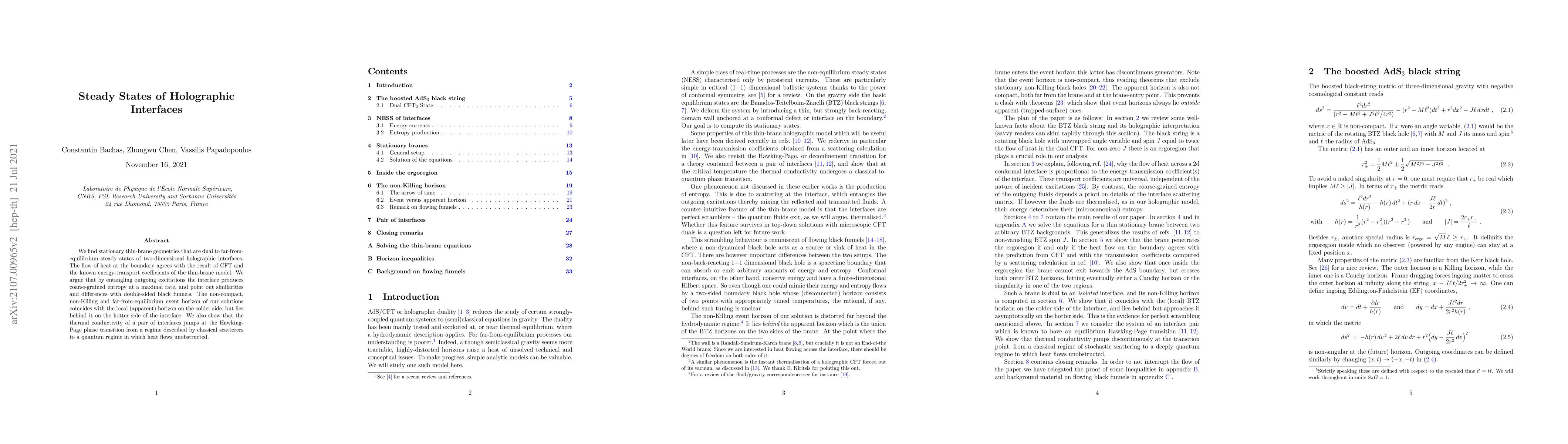 We find stationary thin-brane geometries that are dual to far-from-equilibrium steady states of two-dimensional holographic interfaces. The flow of heat at the boundary agrees with the result of CFT and the known energy-transport coefficients of the thin-brane model. We argue that by entangling outgoing excitations the interface produces coarse-grained entropy at a maximal rate, and point out similarities and differences with double-sided black funnels. The non-compact, non-Killing and far from-equilibrium event horizon of our solutions coincides with the local (apparent) horizon on the colder side, but lies behind it on the hotter side of the interface. We also show that the thermal conductivity of a pair of interfaces jumps at the Hawking-Page phase transition from a regime described by classical scatterers to a quantum regime in which heat flows unobstructed.