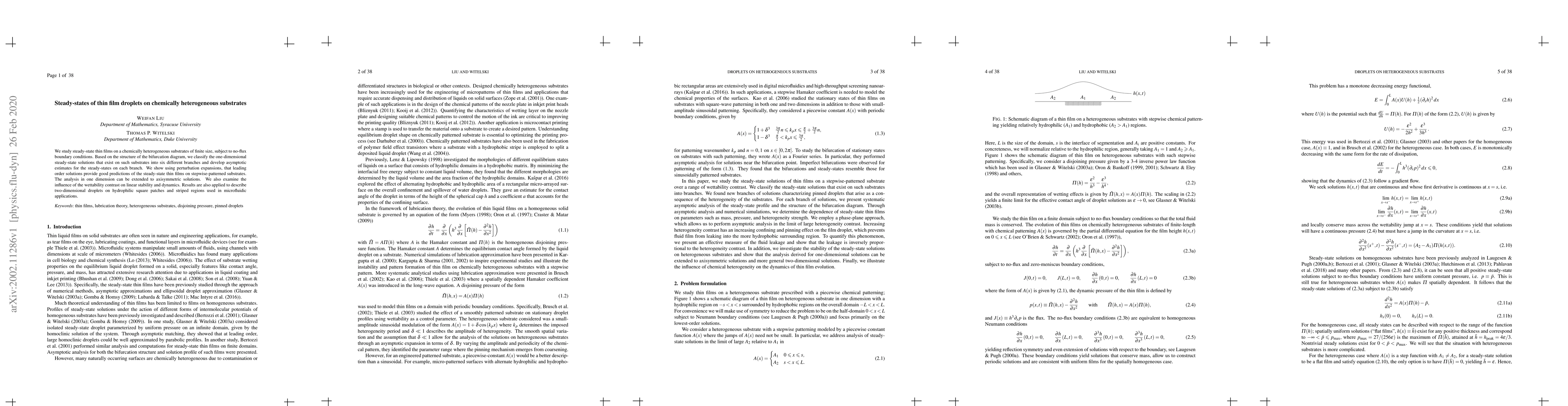 This paper classifies steady-state thin film solutions on chemically heterogeneous substrates into six branches and provides asymptotic estimates for each. It demonstrates that leading order solutions accurately predict the behavior of thin films on patterned substrates, extending the analysis to axisymmetric solutions and examining the impact of wettability contrast on stability and dynamics.