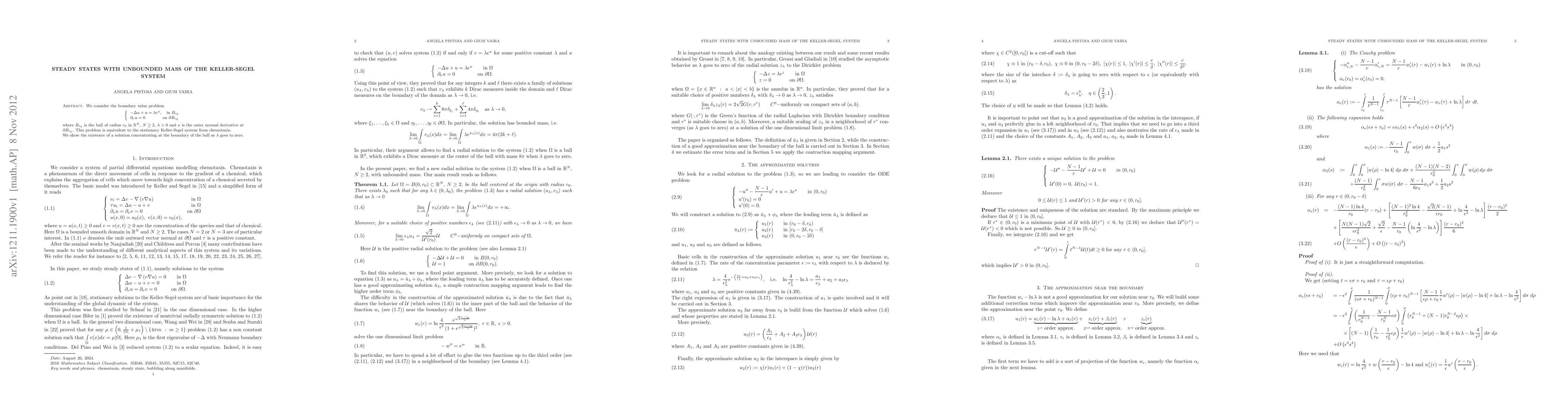 Summary: This paper investigates the stationary Keller-Segel chemotaxis system within a ball, demonstrating the existence of a solution that concentrates mass at the boundary of the ball.