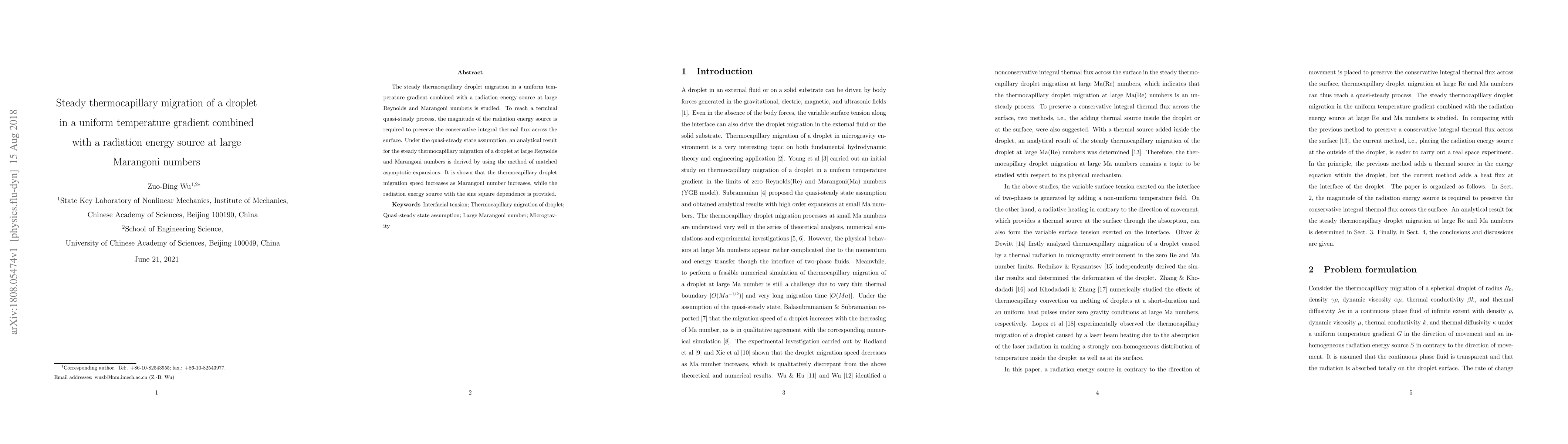 This paper investigates the steady thermocapillary migration of a droplet under a uniform temperature gradient and radiation energy source at high Reynolds and Marangoni numbers. An analytical solution is derived using matched asymptotic expansions, revealing that the droplet's migration speed rises with increasing Marangoni number, while the radiation energy source maintains a sine square dependence.