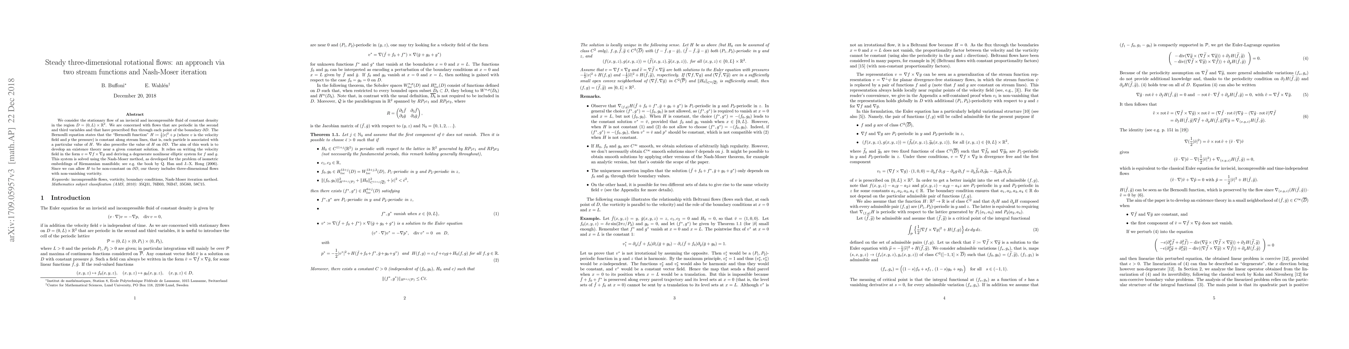 We consider the stationary flow of an inviscid and incompressible fluid of constant density in the region $D=(0, L)\times \mathbb{R}^2$. We are concerned with flows that are periodic in the second and third variables and that have prescribed flux through each point of the boundary $\partial D$. The Bernoulli equation states that the "Bernoulli function" $H:= \frac 1 2 |v|^2+p$ (where $v$ is the velocity field and $p$ the pressure) is constant along stream lines, that is, each particle is associated with a particular value of $H$. We also prescribe the value of $H$ on $\partial D$. The aim of this work is to develop an existence theory near a given constant solution. It relies on writing the velocity field in the form $v=\nabla f\times \nabla g$ and deriving a degenerate nonlinear elliptic system for $f$ and $g$. This system is solved using the Nash-Moser method, as developed for the problem of isometric embeddings of Riemannian manifolds; see e.g. the book by Q. Han and J.-X. Hong (2006). Since we can allow $H$ to be non-constant on $\partial D$, our theory includes three-dimensional flows with non-vanishing vorticity.