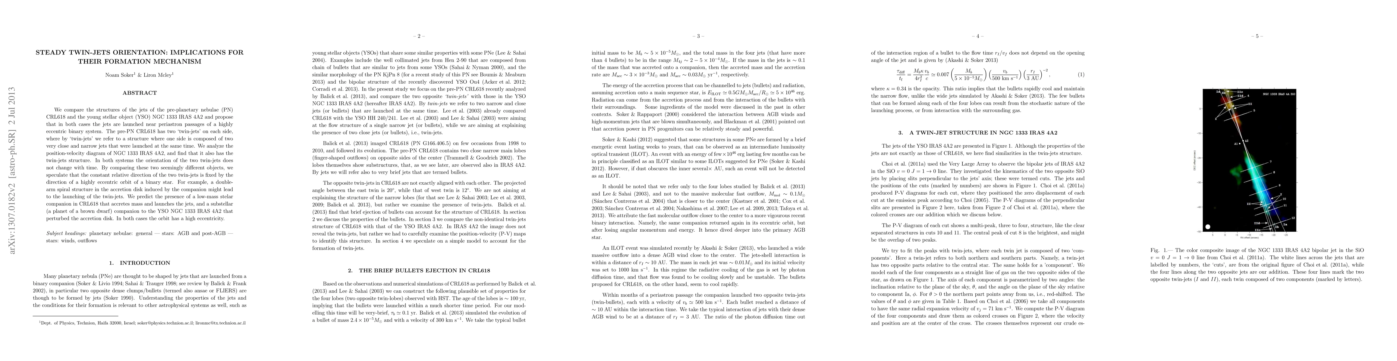 We compare the structures of the jets of the pre-planetary nebulae (PN) CRL618 and the young stellar object (YSO) NGC 1333 IRAS4A2 and propose that in both cases the jets are launched near periastron passages of a highly eccentric binary system. The pre-PN CRL618 has two `twin-jets' on each side, where by `twin-jets' we refer to a structure where one side is composed of two very close and narrow jets that were launched at the same time. We analyze the position-velocity diagram of NGC 1333 IRAS4A2, and find that it also has the twin-jets structure. In both systems the orientation of the two twin-jets does not change with time. By comparing these two seemingly different objects, we speculate that the constant relative direction of the two twin-jets is fixed by the direction of a highly eccentric orbit of a binary star. For example, a double-arm spiral structure in the accretion disk induced by the companion might lead to the launching of the twin-jets. We predict the presence of a low-mass stelar companion in CRL618 that accretes mass and launches the jets, and a substellar (a planet of a brown dwarf) companion to the YSO NGC 1333 IRAS4A2 that perturbed the accretion disk. In both cases the orbit has a high eccentricity.