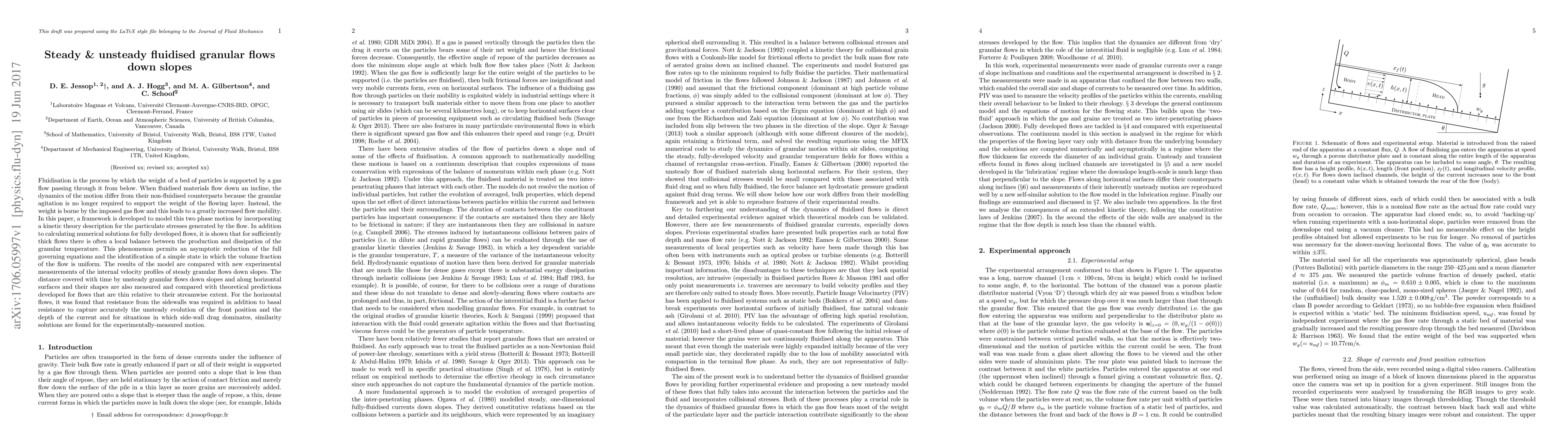This paper develops a framework to model steady and unsteady fluidised granular flows down slopes, incorporating kinetic theory for particulate stresses. It identifies a local balance between production and dissipation of granular temperature, leading to a simplified state with uniform volume fraction, and compares model predictions with experimental measurements of internal velocity profiles and flow dynamics.