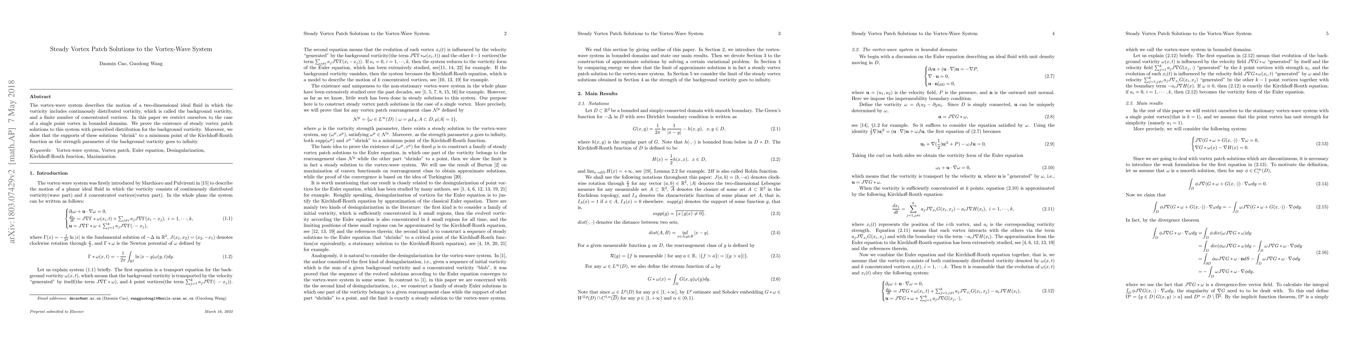 This paper investigates steady vortex patch solutions for the vortex-wave system in a two-dimensional ideal fluid, focusing on a single point vortex in bounded domains. The authors prove the existence of such solutions under prescribed background vorticity distributions and demonstrate that the solutions' supports converge to a minimum of the Kirchhoff-Routh function as the background vorticity strength increases.