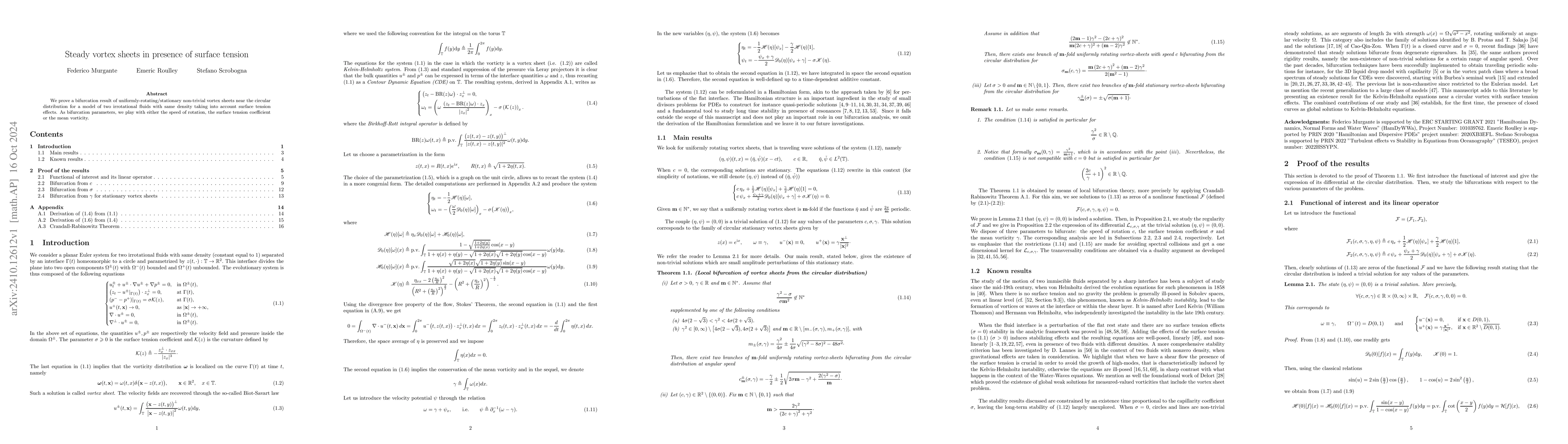 This paper demonstrates a bifurcation of non-trivial vortex sheets in irrotational fluids with uniform density under surface tension, revealing how rotation speed, surface tension, or mean vorticity influence the sheet's behavior. The study focuses on sheets near circular distributions.