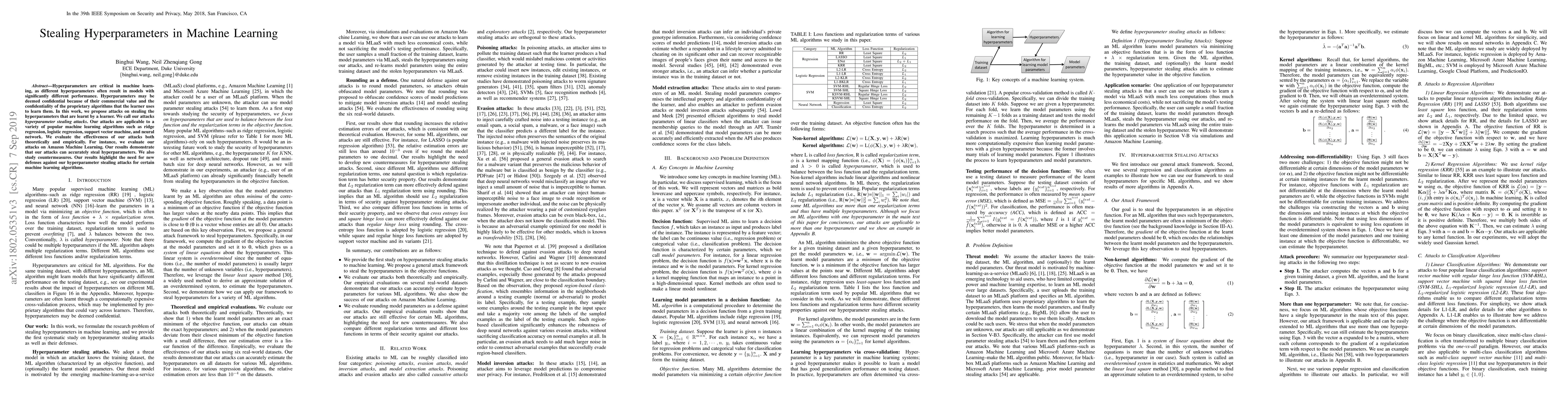 Hyperparameters are critical in machine learning, as different hyperparameters often result in models with significantly different performance. Hyperparameters may be deemed confidential because of their commercial value and the confidentiality of the proprietary algorithms that the learner uses to learn them. In this work, we propose attacks on stealing the hyperparameters that are learned by a learner. We call our attacks hyperparameter stealing attacks. Our attacks are applicable to a variety of popular machine learning algorithms such as ridge regression, logistic regression, support vector machine, and neural network. We evaluate the effectiveness of our attacks both theoretically and empirically. For instance, we evaluate our attacks on Amazon Machine Learning. Our results demonstrate that our attacks can accurately steal hyperparameters. We also study countermeasures. Our results highlight the need for new defenses against our hyperparameter stealing attacks for certain machine learning algorithms.