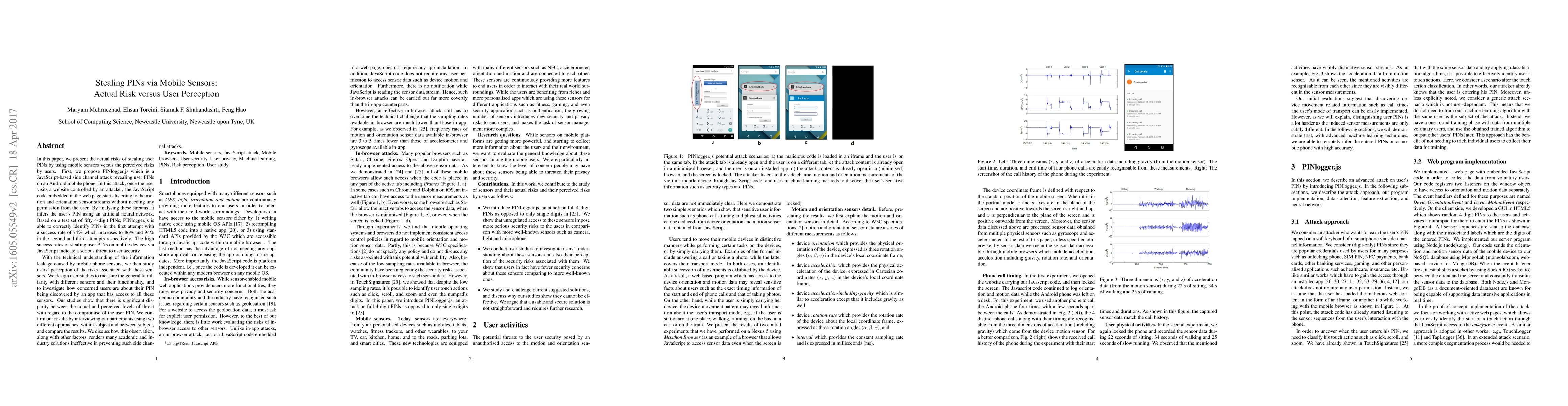 This paper investigates the actual risk of stealing user PINs via mobile sensors using a JavaScript-based side channel attack, PINlogger.js, which successfully infers PINs from sensor data with high accuracy. It contrasts this with users' perceptions of such risks, revealing a significant disparity between actual and perceived threats.