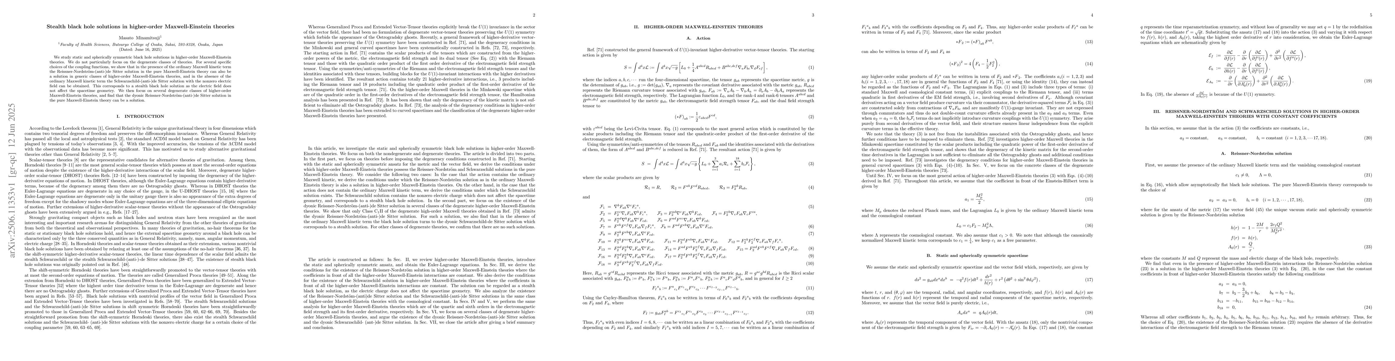 We study static and spherically symmetric black hole solutions in higher-order Maxwell-Einstein theories. We do not particularly focus on the degenerate classes of theories. For several specific choices of the coupling functions, we show that in the presence of the ordinary Maxwell kinetic term the Reissner-Nordstr\"om-(anti-)de Sitter solution in the pure Maxwell-Einstein theory can also be a solution in generic classes of higher-order Maxwell-Einstein theories, and in the absence of the ordinary Maxwell kinetic term the Schwarzschild-(anti-)de Sitter solution with the nonzero electric field can be obtained. This corresponds to a stealth black hole solution as the electric field does not affect the spacetime geometry. We then focus on several degenerate classes of higher-order Maxwell-Einstein theories, and find that the dyonic Reissner-Nordstr\"om-(anti-)de Sitter solution in the pure Maxwell-Einstein theory can be a solution.
