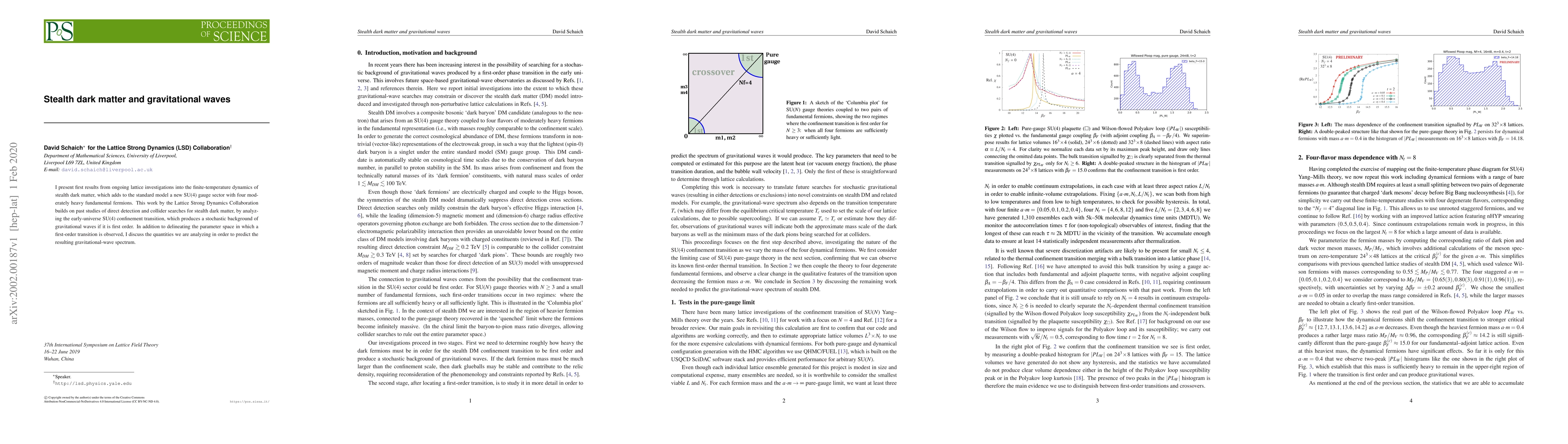 I present first results from ongoing lattice investigations into the finite-temperature dynamics of stealth dark matter, which adds to the standard model a new SU(4) gauge sector with four moderately heavy fundamental fermions. This work by the Lattice Strong Dynamics Collaboration builds on past studies of direct detection and collider searches for stealth dark matter, by analyzing the early-universe SU(4) confinement transition, which produces a stochastic background of gravitational waves if it is first order. In addition to delineating the parameter space in which a first-order transition is observed, I discuss the quantities we are analyzing in order to predict the resulting gravitational-wave spectrum.