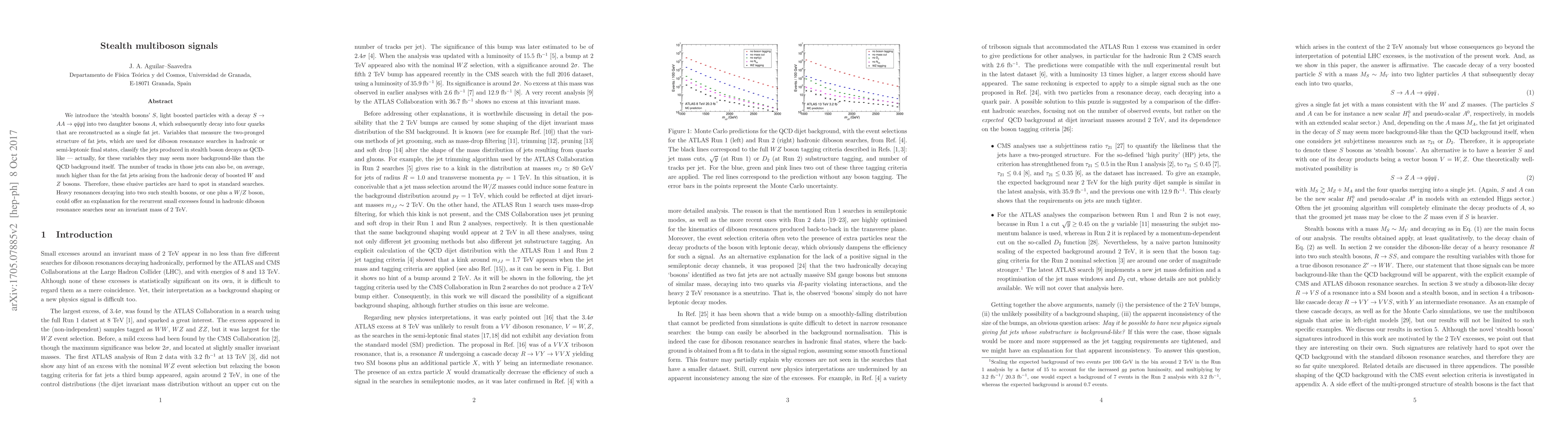 We introduce the `stealth bosons' $S$, light boosted particles with a decay $S \to AA \to q \bar q q \bar q$ into two daughter bosons $A$, which subsequently decay into four quarks that are reconstructed as a single fat jet. Variables that measure the two-pronged structure of fat jets, which are used for diboson resonance searches in hadronic or semi-leptonic final states, classify the jets produced in stealth boson decays as QCD-like - actually, for these variables they may seem more background-like than the QCD background itself. The number of tracks in those jets can also be, on average, much higher than for the fat jets arising from the hadronic decay of boosted $W$ and $Z$ bosons. Therefore, these elusive particles are hard to spot in standard searches. Heavy resonances decaying into two such stealth bosons, or one plus a $W/Z$ boson, could offer an explanation for the recurrent small excesses found in hadronic diboson resonance searches near an invariant mass of 2 TeV.