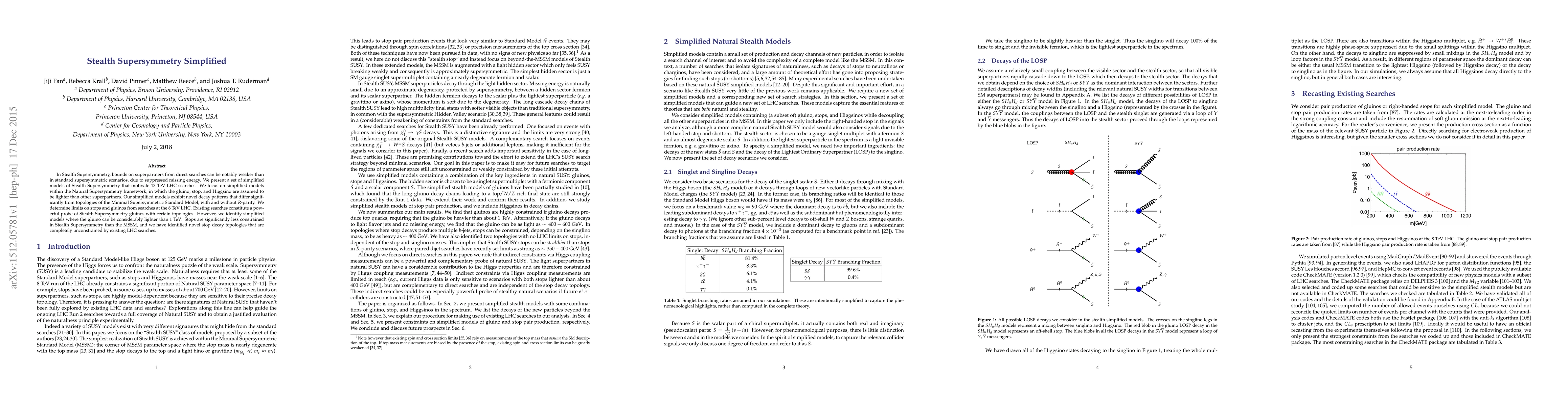 This paper explores Stealth Supersymmetry, a framework where superpartners evade direct search constraints due to suppressed missing energy. It presents simplified models that motivate 13 TeV LHC searches, focusing on scenarios where gluinos, stops, and Higgsinos are lighter, revealing novel decay patterns and identifying regions where gluinos can be significantly lighter than 1 TeV, while stop constraints remain less stringent compared to the Minimal Supersymmetric Standard Model.