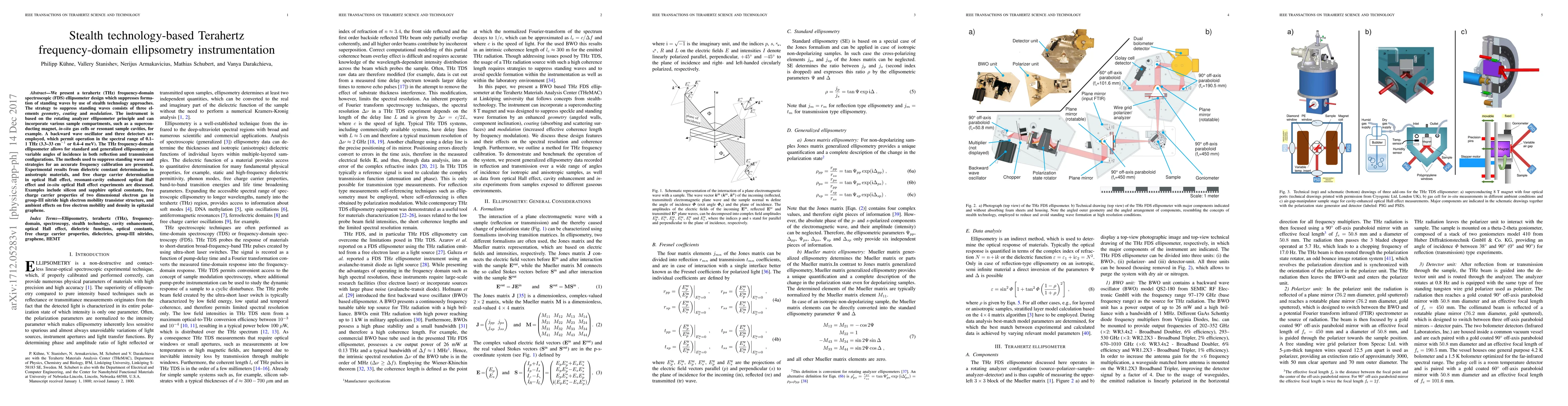We present a terahertz (THz) frequency-domain spectroscopic (FDS) ellipsometer design which suppresses formation of standing waves by use of stealth technology approaches. The strategy to suppress standing waves consists of three elements \textit{geometry}, \textit{coating} and \textit{modulation}. The instrument is based on the rotating analyzer ellipsometer principle and can incorporate various sample compartments, such as a superconducting magnet, \textit{in-situ} gas cells or resonant sample cavities, for example. A backward wave oscillator and three detectors are employed, which permit operation in the spectral range of 0.1--1~THz (3.3--33~cm$^{-1}$ or 0.4--4~meV). The THz frequency-domain ellipsometer allows for standard and generalized ellipsometry at variable angles of incidence in both reflection and transmission configurations. The methods used to suppress standing waves and strategies for an accurate frequency calibration are presented. Experimental results from dielectric constant determination in anisotropic materials, and free charge carrier determination in optical Hall effect, resonant-cavity enhanced optical Hall effect and \textit{in-situ} optical Hall effect experiments are discussed. Examples include silicon and sapphire optical constants, free charge carrier properties of two dimensional electron gas in group-III nitride high electron mobility transistor structure, and ambient effects on free electron mobility and density in epitaxial graphene.