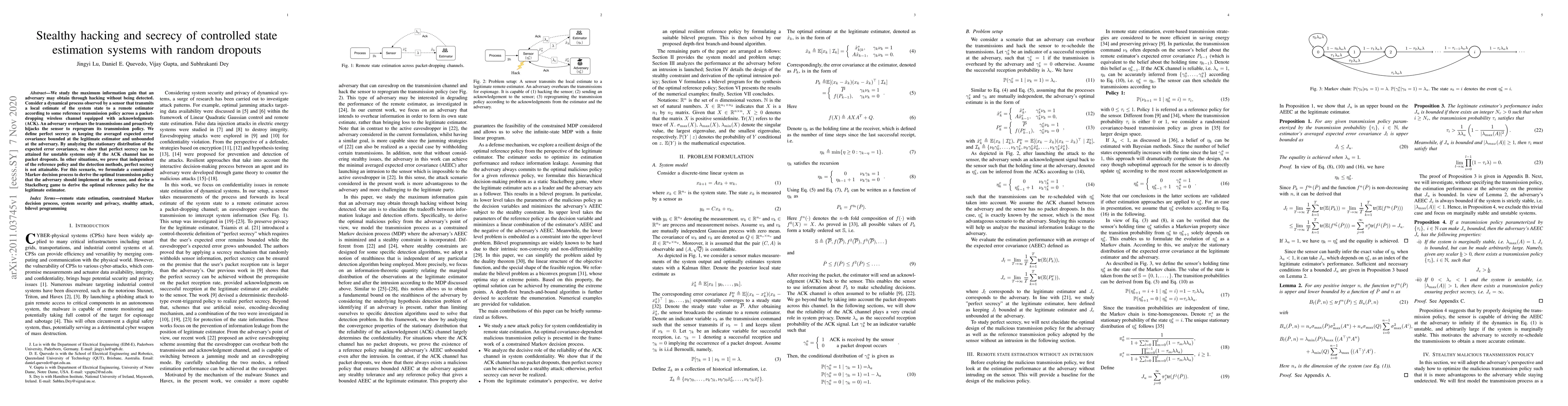 This research examines how an adversary can covertly manipulate state estimation systems with packet dropouts. It reveals that perfect secrecy, or undetected information gain, is only possible for unstable systems without dropout-free ACK channels. For other cases, the study formulates a game theory approach to find optimal transmission and reference policies, despite perfect secrecy being unattainable.