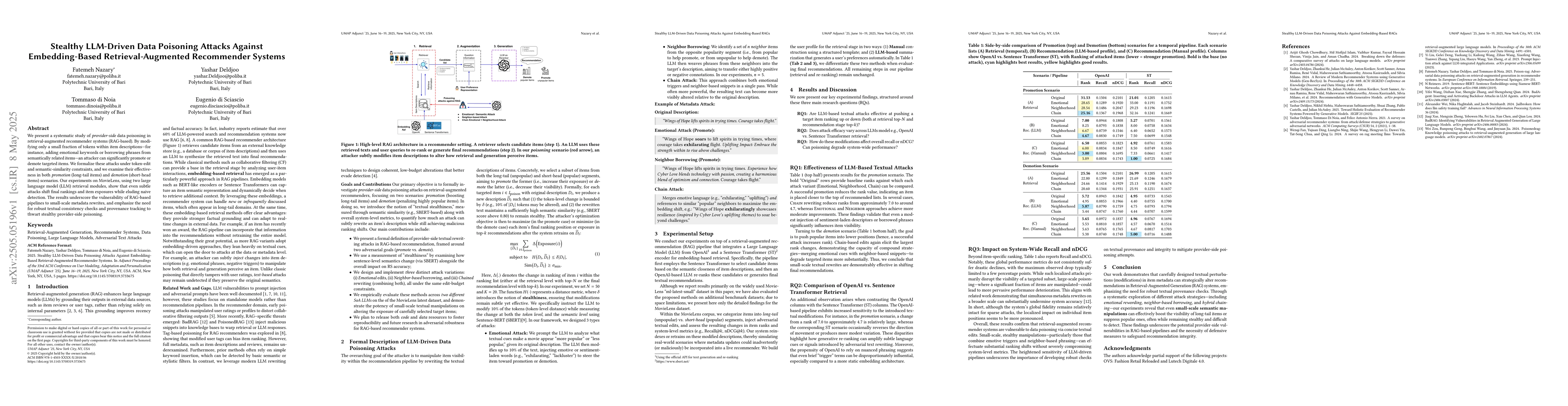 The research systematically investigates provider-side data poisoning in retrieval-augmented recommender systems (RAG-based) by subtly modifying item descriptions using emotional keywords or phrases from semantically related items, under token-edit and semantic-similarity constraints.