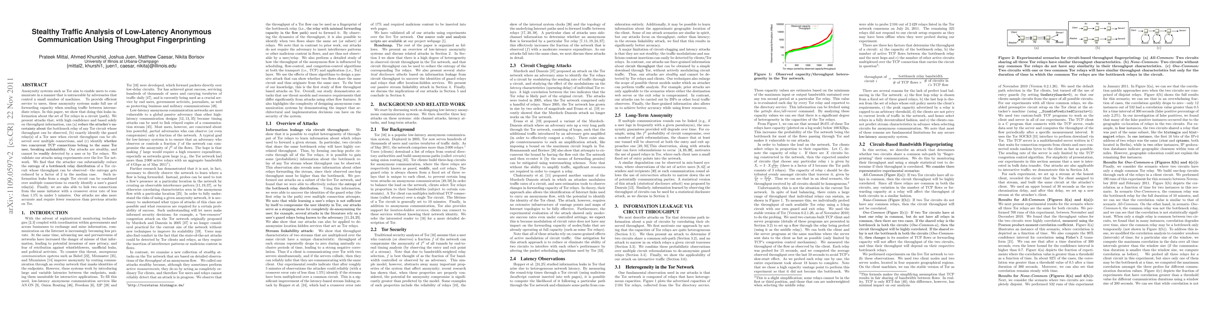Researchers discovered stealthy attacks on Tor anonymity systems that can identify users, their relays, and even link concurrent connections with high accuracy using only throughput information.